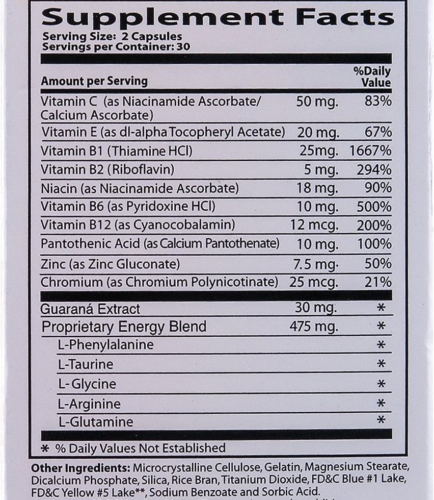 60 Caps Energy - Amino Acids Vitamin B1 B2 B6 B12 - Increases Brain Alertness & Stamina