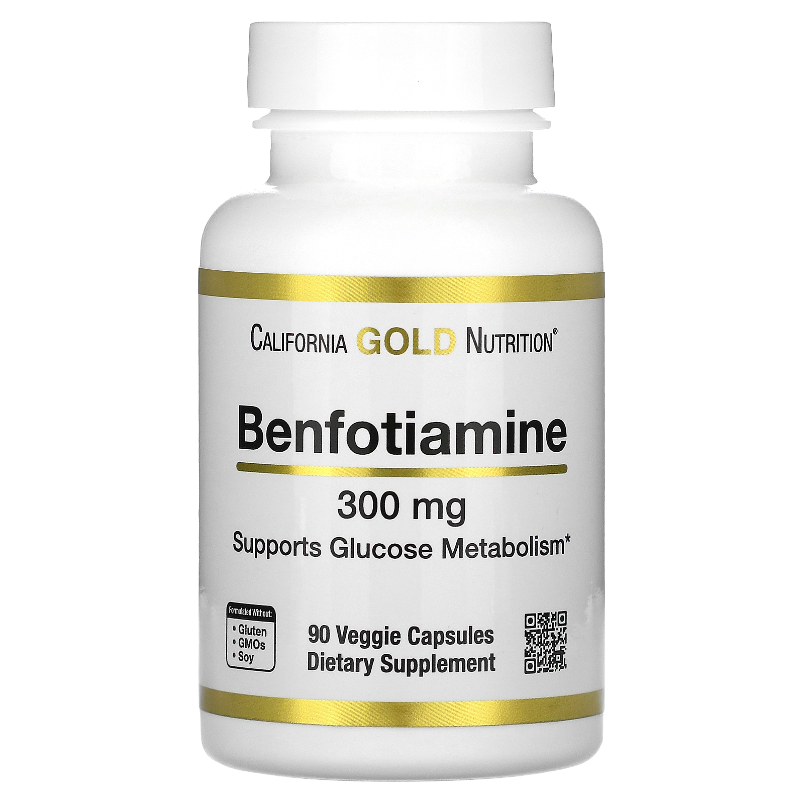 California Gold Nutrition® Benfotiamine, 300 mg Featuring BenfoPure ® Benfotiamine Suitable for Vegetarians and Vegans Supports Glucose Metabolism* Formulated without Gluten, GMOs, or Soy 100% Gold Guarantee Benfotiamine is a derivative of thiamin, a B vitamin essential for energy production. Supplementing your diet with benfotiamine can support your body’s natural metabolization of glucose, which can help maintain healthy blood glucose levels.* Formulated with BenfoPure ® Benfotiamine BenfoPure ® is a branded form of benfotiamine that was designed to provide nutritional support for healthy blood sugar levels.* Unlike the standard form of thiamine, which is water soluble, BenfoPure ® is fat soluble. This allows for increased bioavailability in the body and means it is much more active than standard forms of thiamine. Blood Sugar and Your Health We all understand that excess sugar can cause weight gain, but it can also cause other, more serious health concerns. The World Health Organization (WHO) recommends maintaining healthy blood sugar levels in order to stay healthy and prevent conditions that can affect the heart, kidneys, brain, and nervous system. California Gold Nutrition Benfotiamine features BenfoPure ® and L-leucine in veggie capsules. When taken as directed, this provides a three-month supply. iTested VerifiedSUGGESTED USE:
