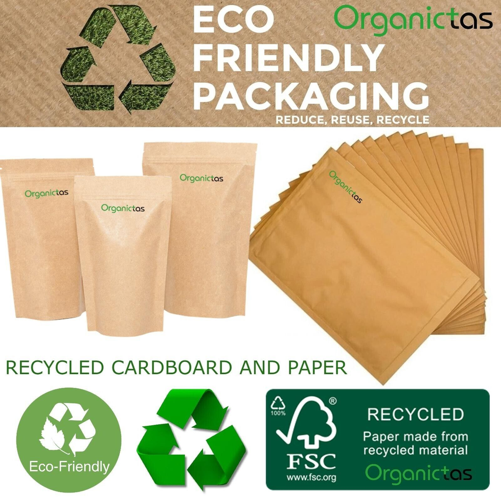 Hand Packed. Eco Friendly Water-proof Kraft Paper Doypacks / Stand-Up Pouches with with Aluminum Foil and Bag Zip.