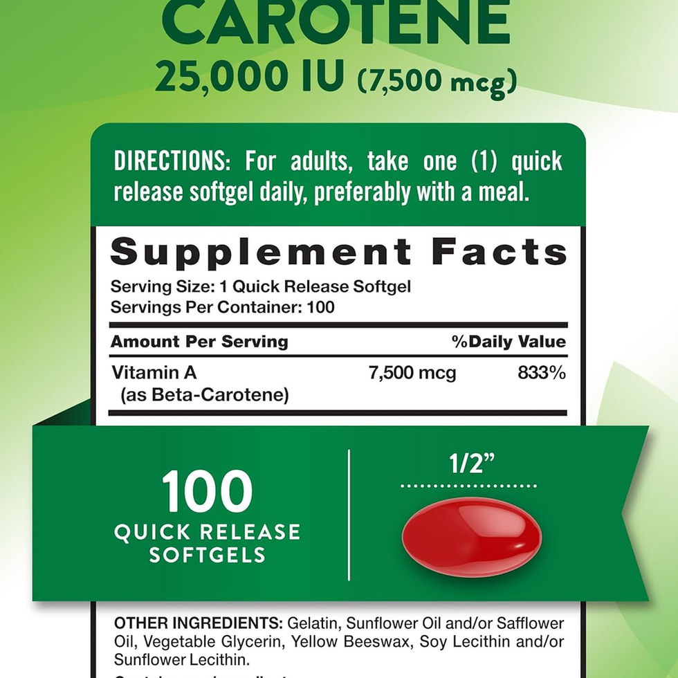 Beta Carotene 25000 IU Softgels | 100 Count | Vitamin a Supplement | Non-Gmo and Gluten Free Supplement