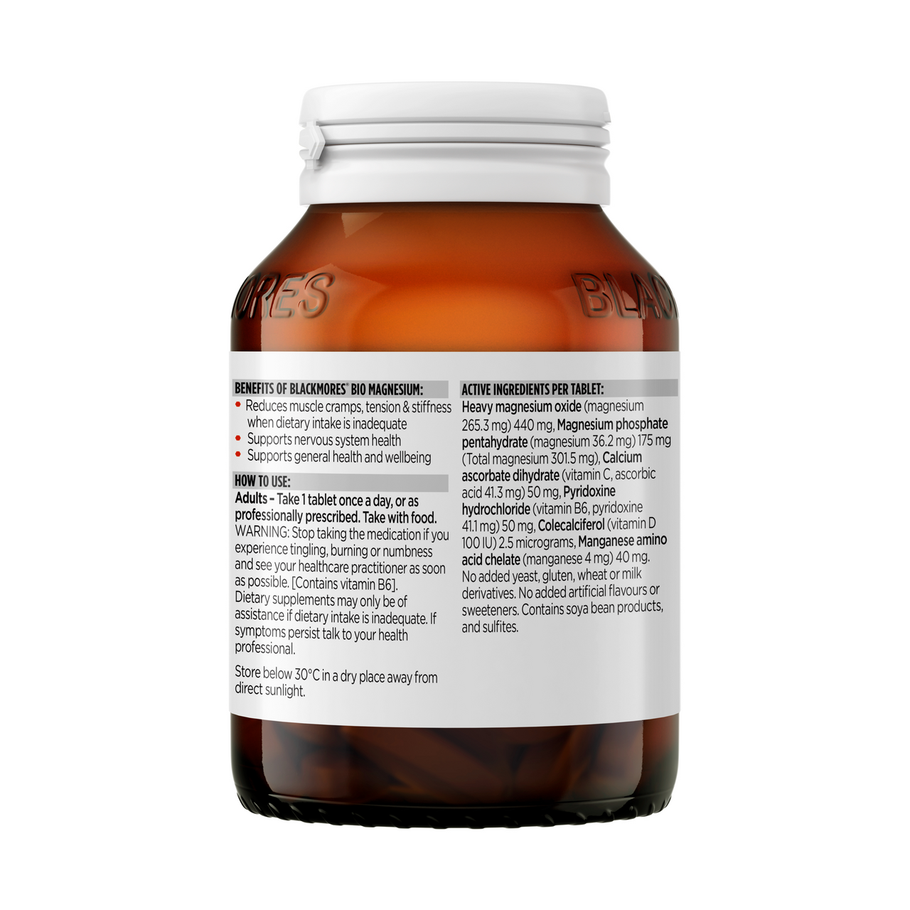 Blackmores Bio Magnesium is a high dose tablet to reduce muscle cramps, tension and stiffness when dietary intake is inadequate. The one-a-day formula also supports heart, bone and nervous system health.