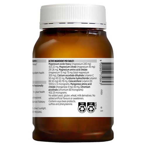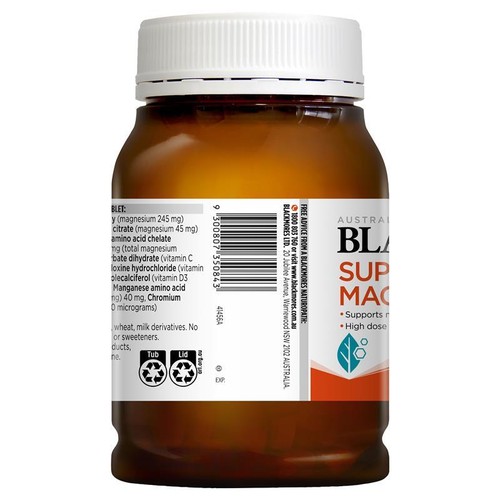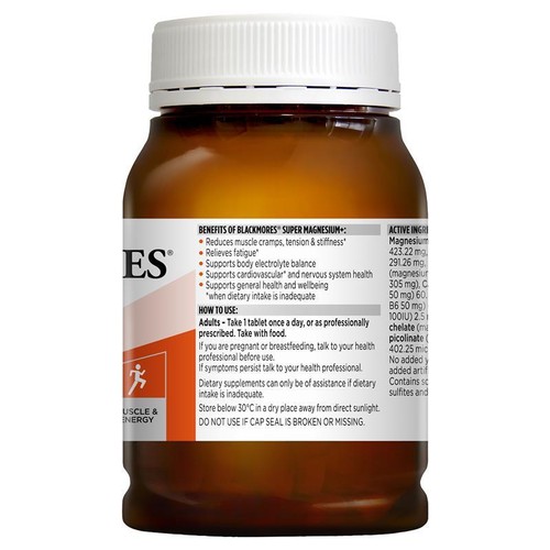 Blackmores Super Magnesium+ contains two easily absorbed forms of magnesium (amino acid chelate and citrate) which help reduce muscle cramps, tension and stiffness when dietary intake is inadequate. This high dose tablet also supports energy levels, muscle endurance and body electrolyte balance, when magnesium levels are low.