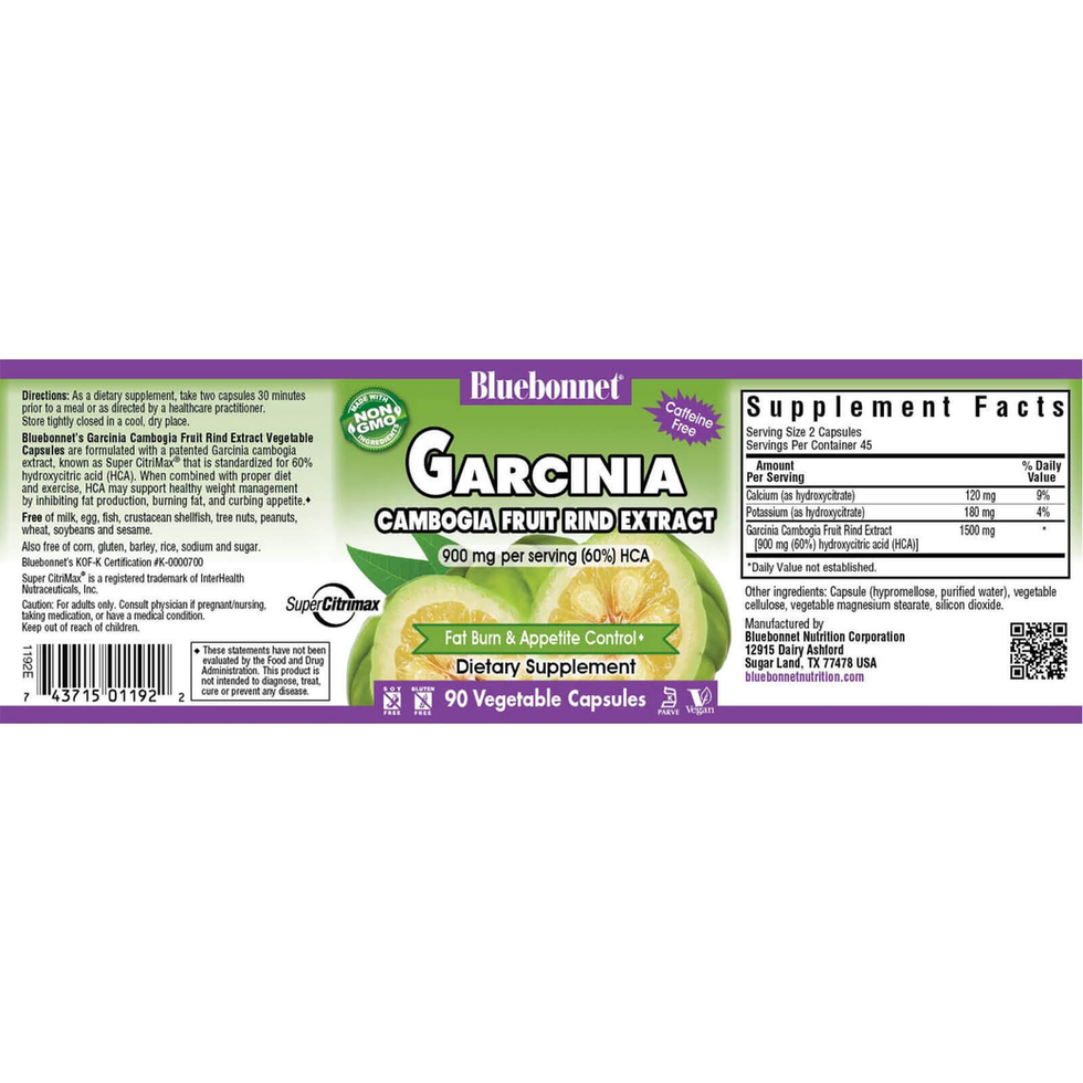 Bluebonnet’s Super Fruit Garcinia Cambogia Fruit Rind Extract Capsules contain 1500 mg per serving of the patented South Asian fruit extract, Garcinia cambogia, known as Super CitriMax®, which is standardized to 60% (or 900 mg) hydroxycitric acid (HCA). This exotic branded super fruit extract is a caffeine-free non-stimulant and has a long safety and efficacy track record in supporting healthy weight management when combined with proper diet and exercise by inhibiting fat production, burning fat and curbing appetite. Available in easy-to-swallow vegetable capsules for maximum assimilation and absorption.♦