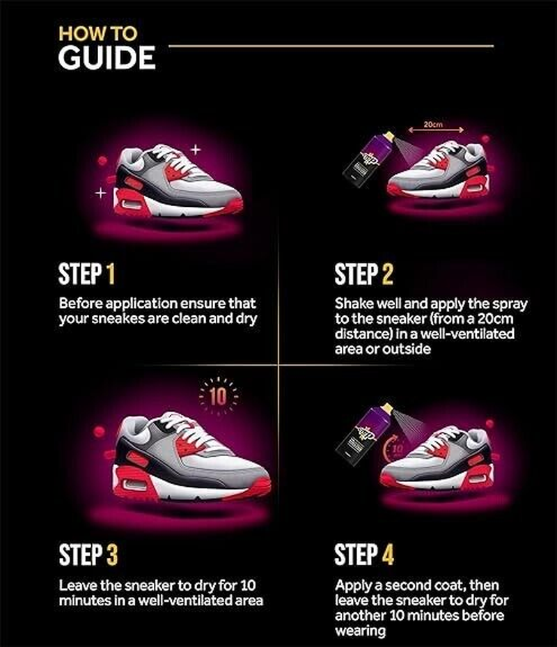 ·Suitable for Most Sneakers - Quick Dry Waterproof Formula Effective on Jordan, White Sneaker, Leather, Suede, Nubuck, Canvas & More - The Treatment Can Last Up To 4 to 5 Weeks. Apply 2 Coats for Best Results