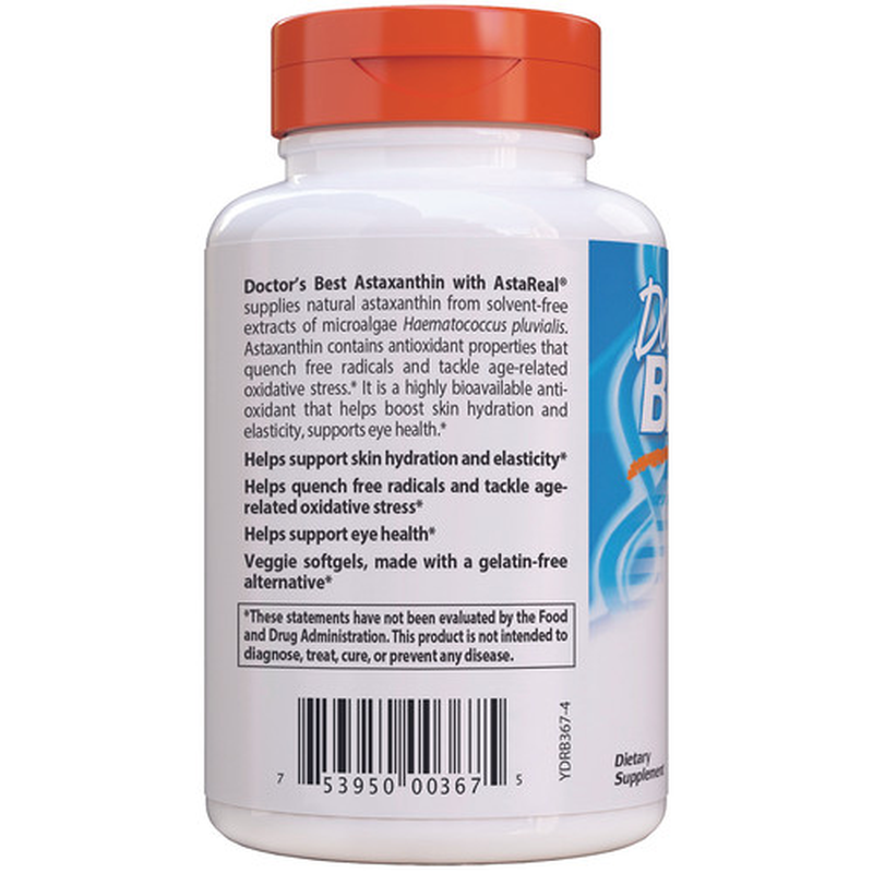 Science-Based Nutrition™ Supports Skin Elasticity for Healthy Aging Dietary Supplement Non-GMO Gluten Free Soy Free Vegan At Doctor's Best, we roll out the red carpet for the king of carotenoids. Our Astaxanthin from AstaReal® is a naturally occurring carotenoid, reigning as an antioxidant powerhouse that helps quench free radicals and addresses age-related oxidative stress. Extracted from microalgae Haematococcus pluvialis without any solvents, this highly bioavailable ingredient maintains optimal quality standards, ensuring both purity and concentration. Supports skin hydration & elasticity Helps quench free radicals and tackle age-related oxidative stress Supports eye healthSUGGESTED USE:
