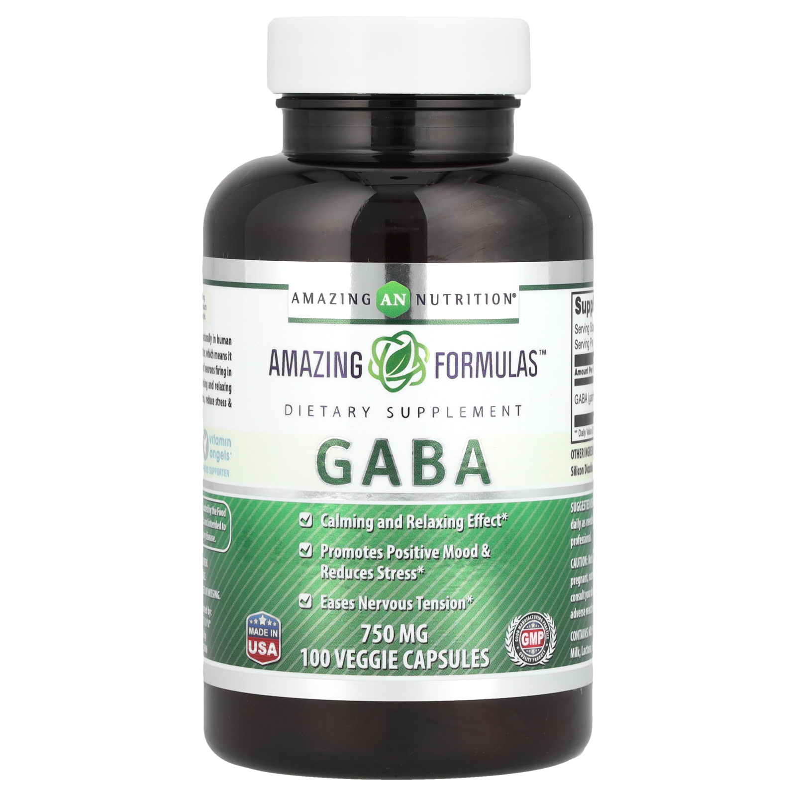 Amazing Formulas™ Dietary Supplement Calming and Relaxing Effect Promotes Positive Mood & Reduces Stress Eases Nervous Tension GMP - Good Manufacturing Practice Quality Product An FDA Regulated Facility Vitamin Angels® Proud Supporter We believe that Amazing Nutrition® is the key for Healthy Living. We are passionate about bringing you the finest selection of products which can perfectly complement a healthy diet and active lifestyle. GABA (gamma-aminobutyric acid) is an amino acid that occurs naturally in human brain and eyes, where it functions as a inhibitory neurotransmitter, which means it regulates brain and nerve cell activity by inhibiting the number of neurons firing in the brain. GABA is an all natural sleep aid that promotes calming and relaxing effect. It may also help to improve mood, ease nervous tension, reduce stress & anxiety, promote lean muscle growth, and relieve dull pain.SUGGESTED USE: