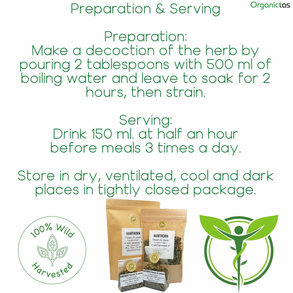 Pure 100% natural organic Crataegus monogyna in the form of dried leaves and flowers. Wild Harvested & Wild crafted in an ecologically clean non-contaminated area in Bulgaria.