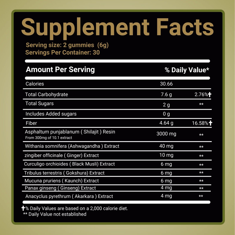 - NATUREāS POWERHOUSE: With "3000 mg Pure Shilajit", InfusĆ©d with potent ingredients including Ashwagandha, Black Musli & Gokshura; our Shilajit Gold Gummies pack a powerful punch of essential nutrients that are 100% natural and organic.