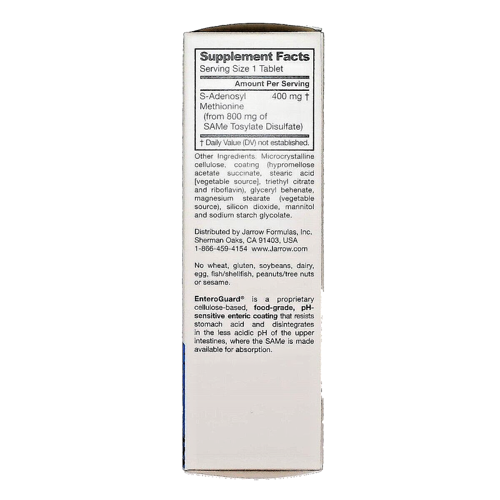 Jarrow Formulas® SAMe 400 provides a full 400 mg SAMe (net yield) from 800 mg of SAMe tosylate disulfate. SAMe 400 is manufactured under low temperature and low humidity and is enteric-coated to ensure a biologically active product.