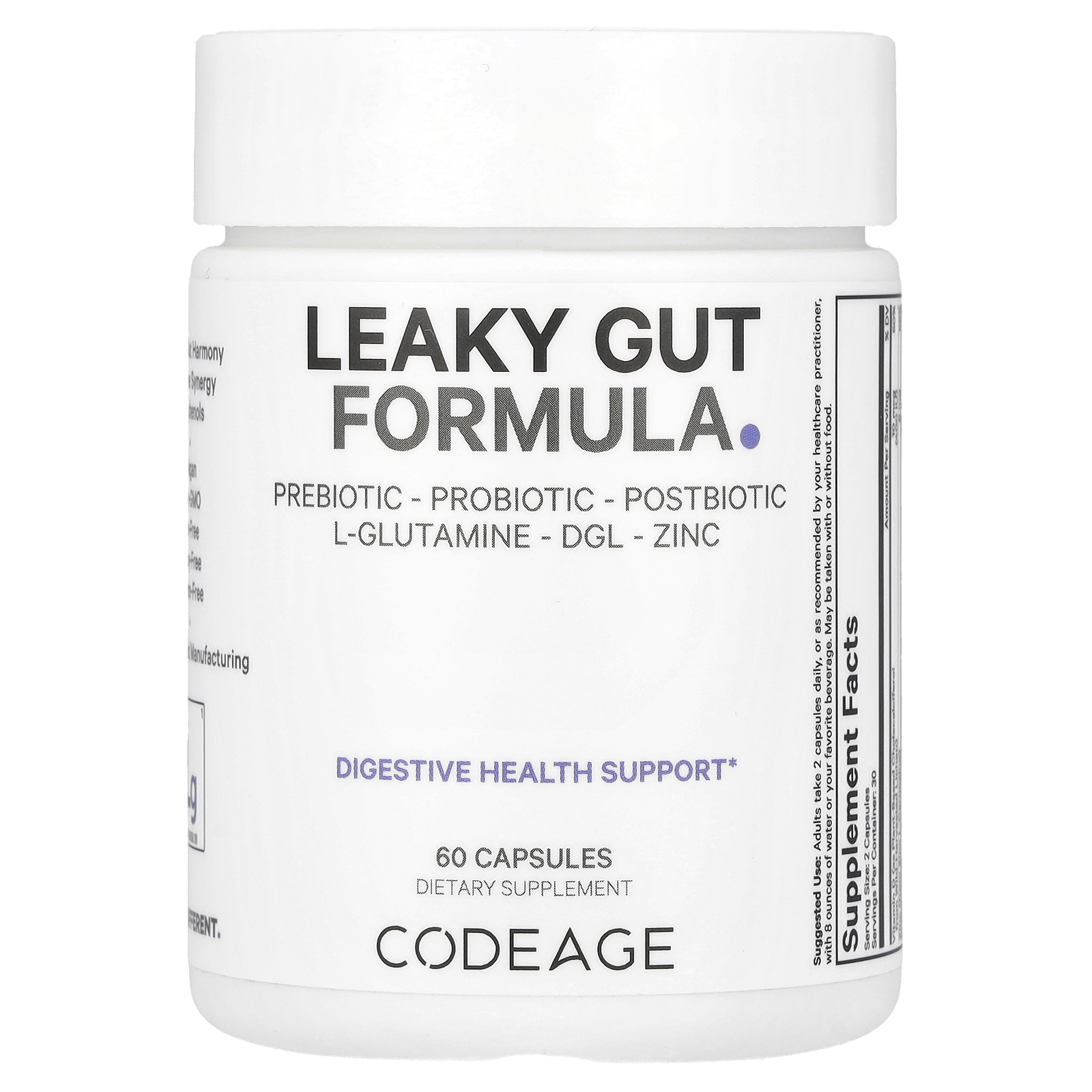 Prebiotic - Probiotic - Postbiotic L-Glutamine - DGL - Zinc Digestive Health Support Dietary Supplement Holistic Gut Harmony Digestive Synergy Polyphenols Vegan Non-GMO Soy-Free Dairy-Free Gluten-Free cGMP Certified Manufacturing Feel Different A comprehensive leaky gut supplement that contains a blend of ingredients to support gut health, including L-glutamine, N-acetylglucosamine, berberine HCL, butyric acid, probiotics, prebiotics, postbiotics, DGL, quercetin, and a variety of extracts to help enhance absorption. Contains a blend of ingredients specifically chosen to support gut health, including L-glutamine, which may help support the integrity of the gut lining and nutrient absorption. Vitamin D is sourced from cholecalciferol to help support gut immunity.* Zinc l-carnosine, N-acetylglucosamine, Butyric acid, Berberine HCL, and organic polyphenols to help support overall gut health. Codeage Leaky Gut supplement formula provides a combination of probiotics, postbiotics, quercetin, ginger, cinnamon, grapefruit, maitake mushroom, and slippery elm. Probiotics help to promote a healthy balance of gut bacteria. Postbiotics are beneficial compounds produced by probiotics that also help support gut health. This gut health supplement includes Deglycyrrhizinated Licorice (DGL), chamomile flower and grapefruit extracts, and BioPerine to enhance absorption. DGL is a form of licorice that has had glycyrrhizin removed.SUGGESTED USE: