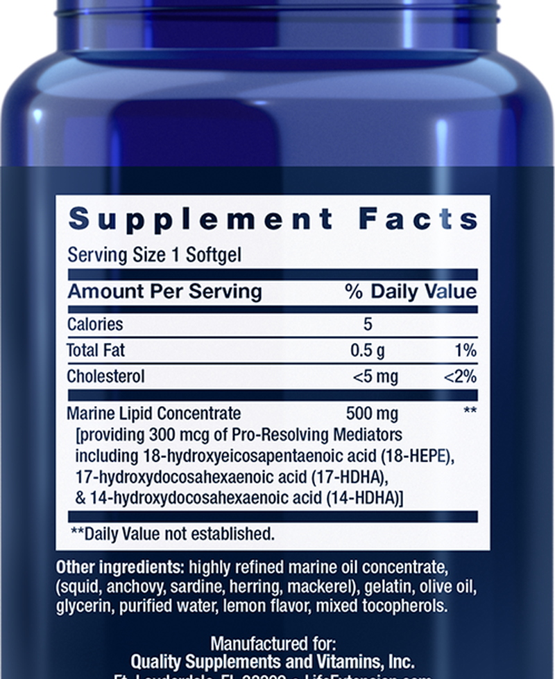 div>I offer multi-bottle discount. Please check the same listing that is offered as a multi-pack.Life Extension Pro-Resolving Mediators 5X30gels Serving Size 1 softgels Calories 5 Total Fat 0.5 g Cholesterol <5 mg Marine Lipid Concentrate 500 mg [providing 300 mcg of Pro-Resolving Mediators including 18-hydroxyeicosapentaenoic acid (18-HEPE), 17-hydroxydocosahexaenoic acid (17-HDHA), & 14-hydroxydocosahexaenoic acid (14-HDHA)] Other ingredients: highly refined marine oil concentrate, (squid, anchovy, sardine, herring, mackerel), gelatin, olive oil, glycerin, purified water, lemon flavor, mixed tocopherols.Pro-Resolving Mediators Benefits