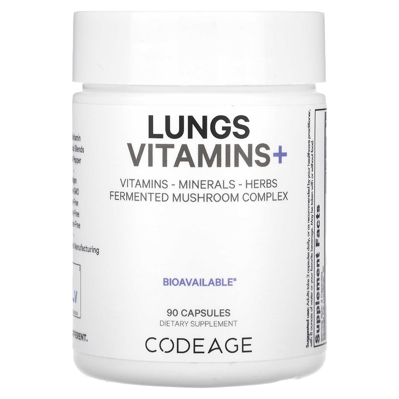 Vitamins - Minerals - Herbs Fermented Mushroom Complex Bioavailable Dietary Supplement Multivitamin Botanical Blends Black Pepper Vegan Non-GMO Soy-Free Dairy-Free Gluten-Free cGMP Certified Manufacturing Feel Different Codeage Lungs Vitamins+ offers a unique blend of vitamins, minerals, bitter botanicals, and fermented ingredients, including vitamins A, C, D, & E, magnesium, zinc, and organic mushrooms designed to help support the immune system, lungs, and respiratory health.SUGGESTED USE: