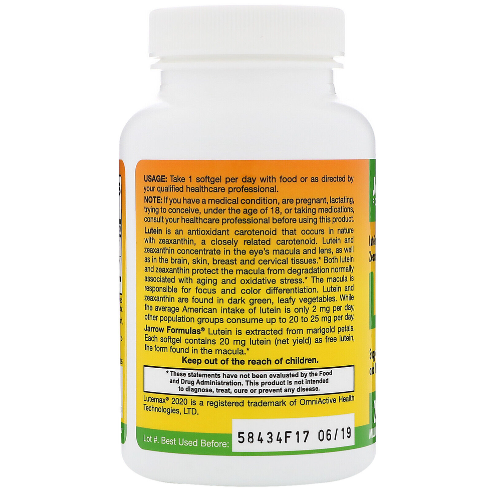 Value Size Lutein 20 mg / Zeaxanthin 4 mg Visual Function Supports Macular Health Gluten Free Dietary Supplement Eye Health Lutemax© 2020 - Lutein & Zeaxanthin Jarrow Formulas® Lutein supports eye health and visual function with lutein and zeaxanthin. Lutein and zeaxanthin are natural antioxidant carotenoids found in dark green, leafy vegetables, and are important components of the macular pigment in the eye, which is responsible for focus and color differentiation.SUGGESTED USE: