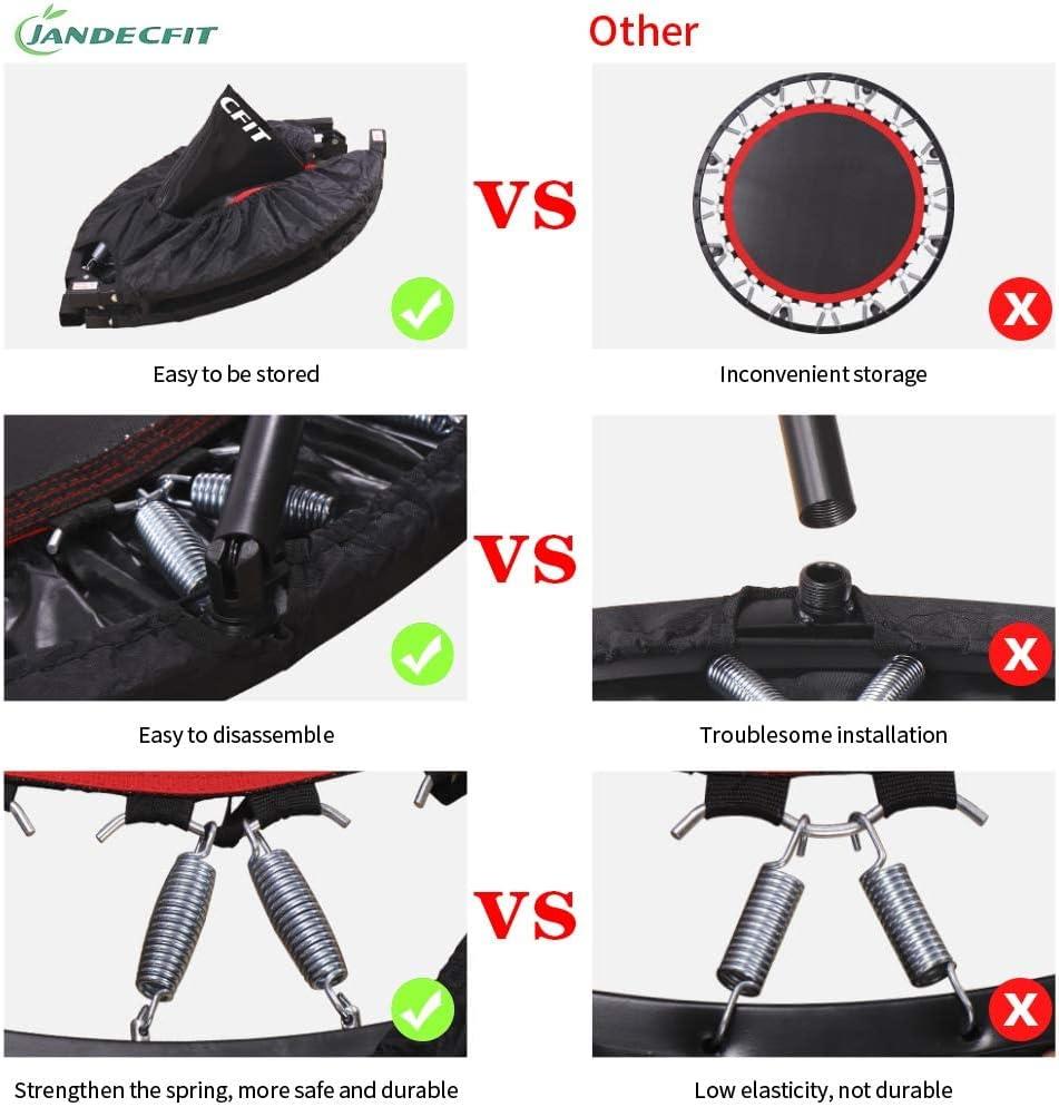 - 【SAFETY AND STABILITY】Jandecfit workout trampoline is made of high-quality steel and high-elasticity spring. The surface of the spring is plated, which has anti-oxidation and anti-rust properties. The base shield is made of strong Oxford fabric, which protects the spring and metal frame from friction and also prevents foot injuries. Greatly improve the safety performance.