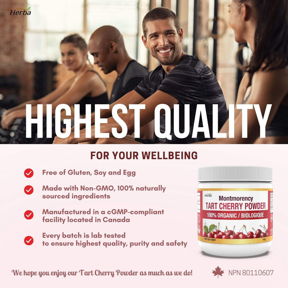 Herba's Montmorency Tart Cherry Powder is crafted from premium organic Montmorency tart cherries (Prunus cerasus), renowned for their rich history and origin in the USA. These cherries are carefully harvested to ensure the highest quality. Our 100% organic powder is a pure, natural source of antioxidants, free from GMOs, gluten, and preservatives, making it an excellent choice for those seeking top-rated dietary supplements in Canada. Manufactured under cGMP standards, this product guarantees purity and potency, embodying the best in natural supplementation. NPN: 80110607Montmorency Tart Cherry Powder – 150g | 100% Organic