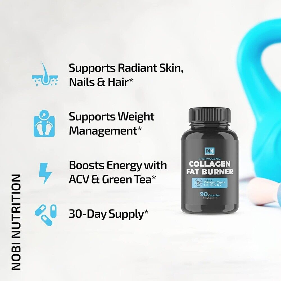 Each bottle of Thermogenic Collagen Fat Burner by Nobi Nutrition contains 90 capsules (30 servings). This supplement is formulated in the USA and sourced from a GMP certified facility.