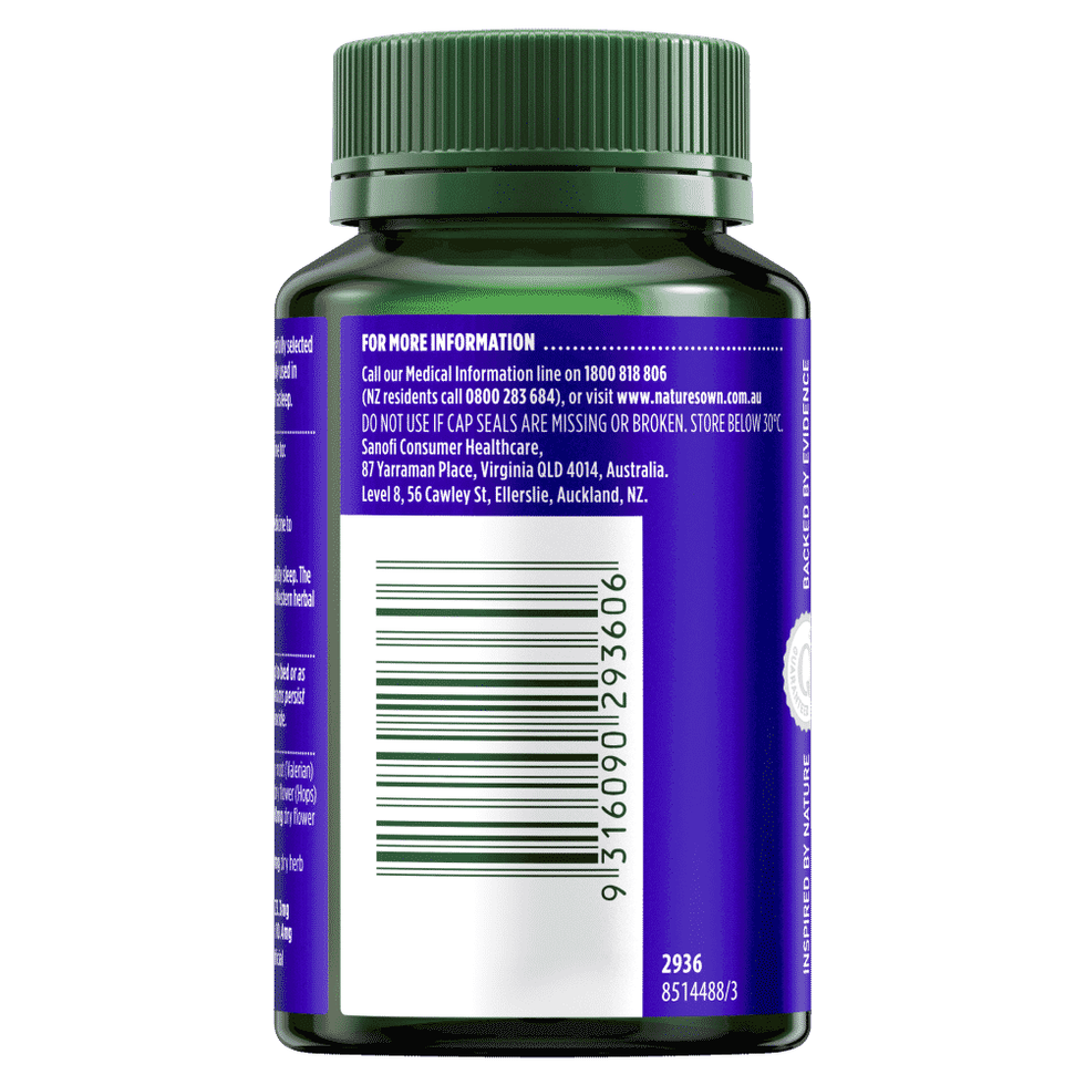 General Information Traditionally used in western herbal medicine to calm nerves and relieve sleeplessness. Nature's Own® Sleep-Ezy is specially formulated with carefully selected ingredients including Valerian which has been traditionally used in Western herbal medicine to reduce the time it takes to fall asleep.Hops has been traditionally* used in Western herbal medicine to:• Calm nerves.• Promote deep sleep.Valerian has been traditionally* used in Western herbal medicine to:• Relieve sleeplessness.Few things are as important for our overall wellbeing as quality sleep. The ingredient Hops in Sleep-Ezy has been traditionally used in Western herbal medicine to improve sleep quality and calm nerves. Size: 100 Capsules. KEY FEATURES • Specially formulated: With carefully selected ingredients including valerian and hops• Contains valerian: Traditionally used in Western herbal medicine to reduce sleeplessness and reduce the time it takes to fall asleep.• Contains hops: Traditionally used in Western herbal medicine to calm nerves and promote deep sleep.• Dosage: Take 2-3 capsules one hour before retiring for sleep, or as recommended by your healthcare professional.• This medicine may not be right for you. Read the warnings before purchase, in warnings section below. Follow the directions for use. If symptoms persist talk to your health professional. Warnings Contains sulfur dioxide. Ingredients Valeriana officinalis dry root extract 139mg, from 556mg dry root (Valerian)Humulus lupulus dry flower extract 33.33mg, from 250mg dry flower (Hops)Matricaria chamomilla dry flower extract 25mg, from 100mg dry flower(Chamomile)Passiflora incarnata dry herb extract 18.18mg, from 100mg dry herb(Passion Flower)Calcium (from Calcium Hydrogen Phosphate dihydrate) 23.3mgMagnesium (from Magnesium Phosphate Pentahydrate) 10.4mg Contains: No added gluten, lactose, artificial colours or flavours, artificial sweeteners, or dairy products. Directions 2-3 capsules daily USAGE ADVICE Take two to three capsules daily one hour before going to bed or as recommended by your healthcare professional. If symptoms persist consult your healthcare professional. STORAGE INSTRUCTIONS BELOW 30°C. CPPNature's Own Sleep-Ezy 100 Capsules