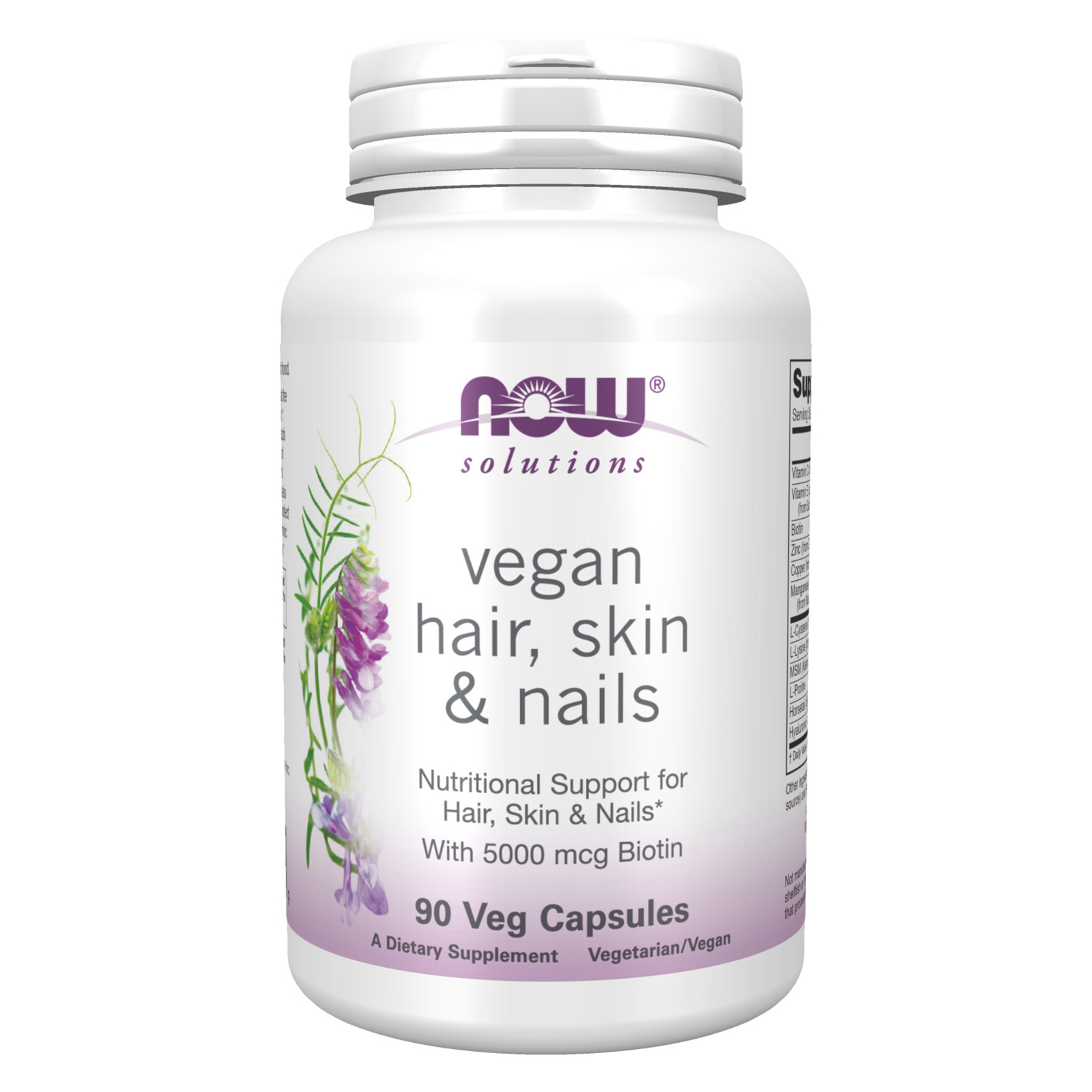 NOW® Solutions Vegan Hair, Skin & Nails works at the cellular level to promote natural beauty from within.* This completely vegan formula offers the amino acids and minerals that are essential for the production of collagen and keratin, which are the main structural components of hair, skin, and nails.* This formula also has the antioxidant vitamins C and E, which help protect skin from free radicals, as well as biotin and hyaluronic acid, which can also support healthy, youthful skin.*