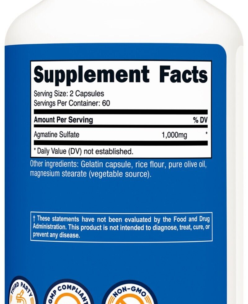 - 120 Capsules (60 Servings) of High Quality Agmatine Sulfate Per Bottle