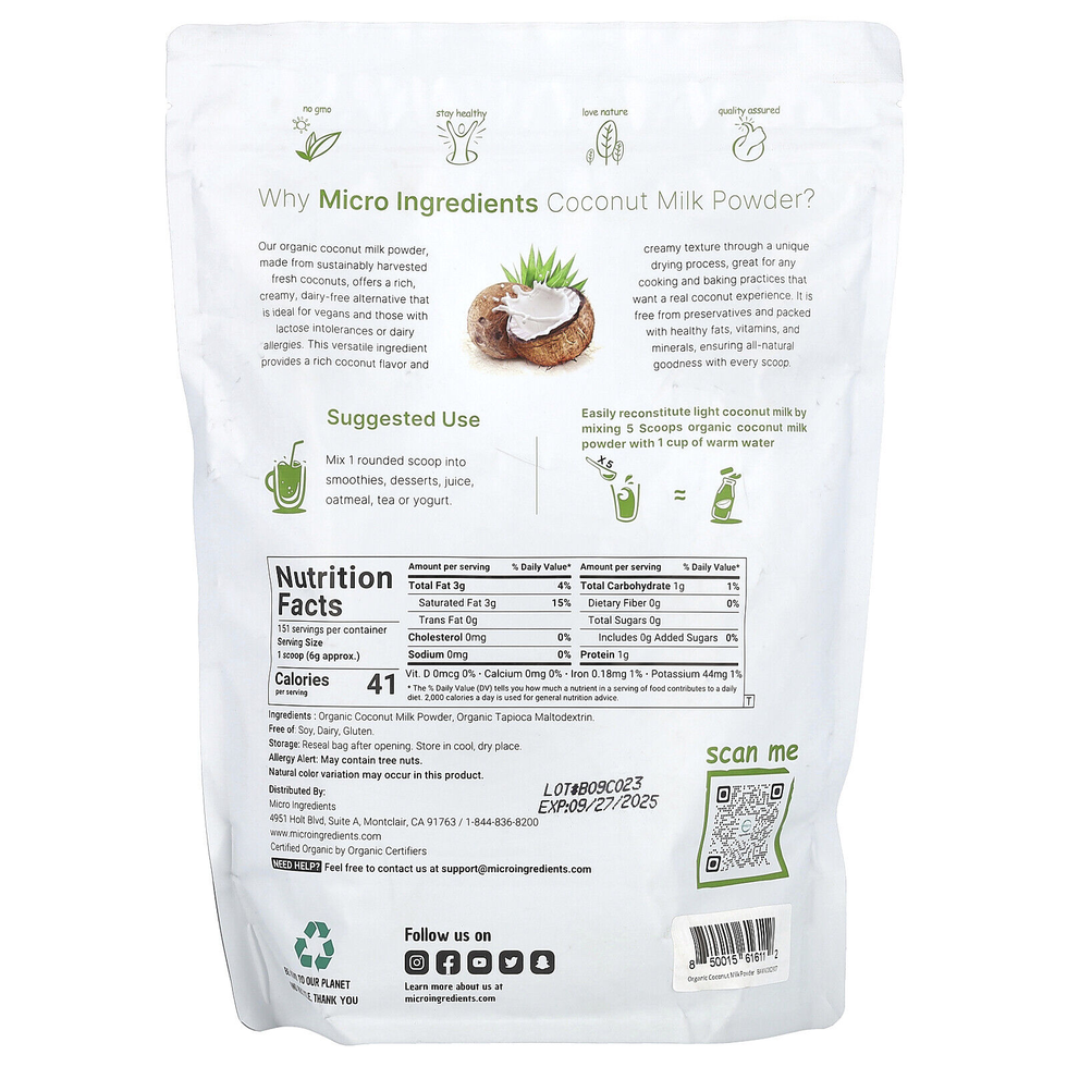 Keto Friendly GMO Free USDA Organic Dairy Free Stay Healthy Love Nature Quality Assured Certified Organic by Organic Certifiers Why Micro Ingredients Coconut Milk Powder? Our organic coconut milk powder, made from sustainably harvested fresh coconuts, offers a rich, creamy, dairy-free alternative that is ideal for vegans and those with lactose intolerances or dairy allergies. This versatile ingredient provides a rich coconut flavor and creamy texture through a unique drying process, great for any cooking and baking practices that want a real coconut experience. It is free from preservatives and packed with healthy fats, vitamins, and minerals, ensuring all-natural goodness with every scoop.SUGGESTED USE: