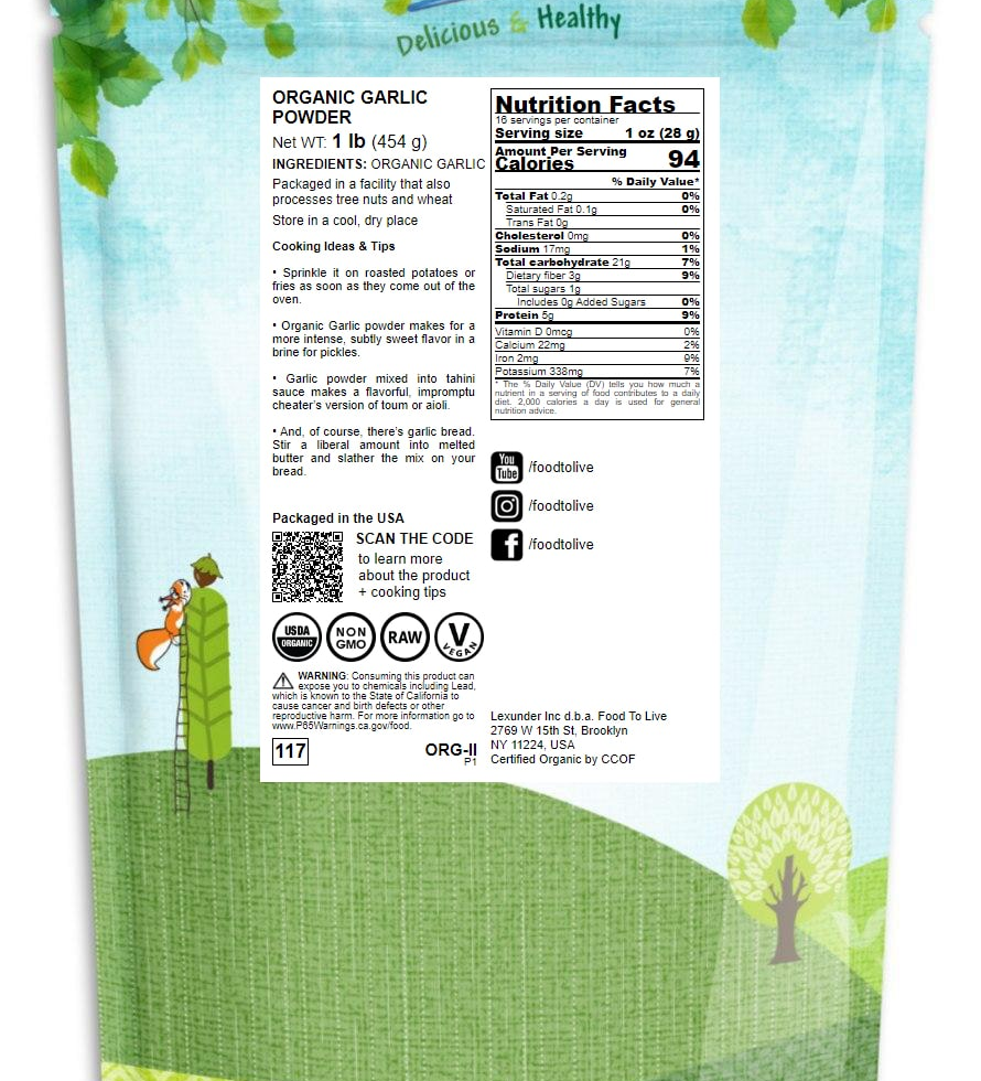 Certified Organic Garlic Powder -Non-GMO, Kosher,Sirtfood,Bulk -by Food to Live