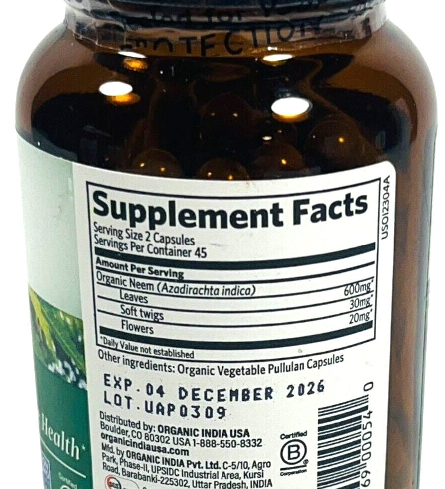 Organic India NEEM - 90 Veggie Caps - Supports Skin & Immune Health - EX 12/26
