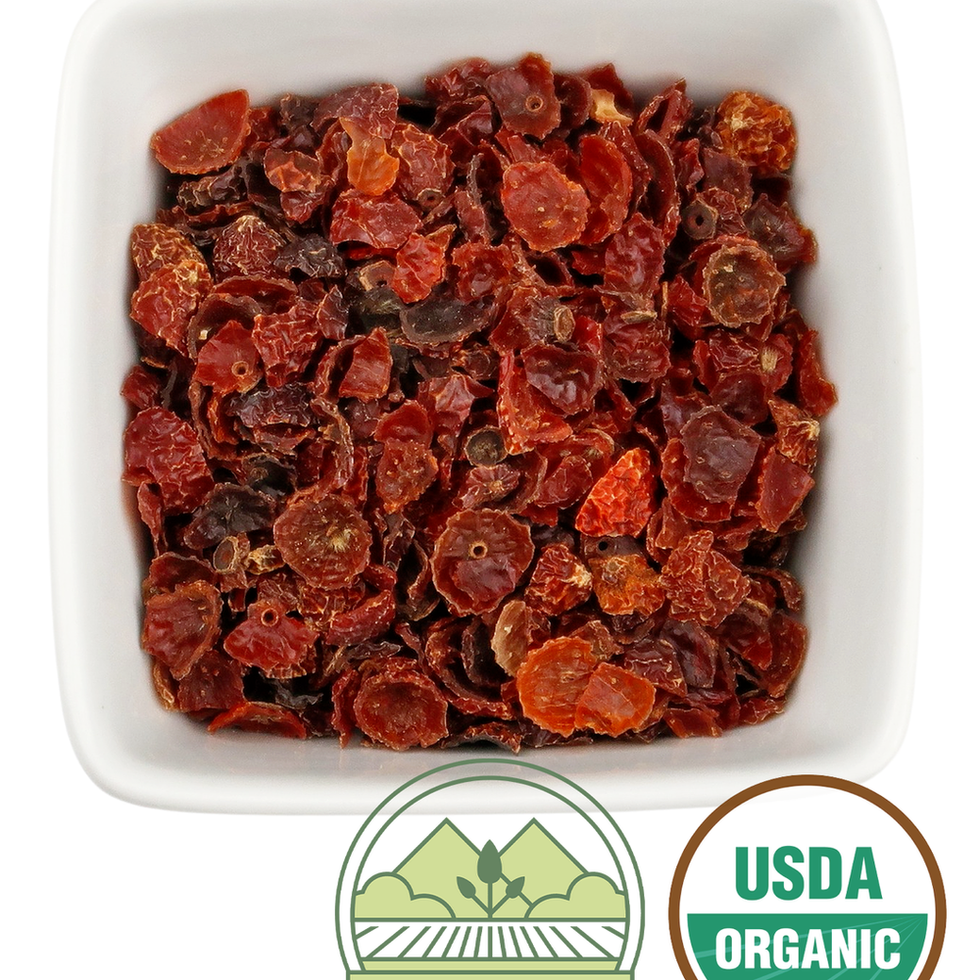 Organic Rose Hips, also known as the fruit of the rose plant, are seedless and are known for their unique sweet-tart flavor and high nutrient content. They are a rich source of vitamin C, antioxidants, and other vitamins and minerals.One of the main benefits of using organic rose hips is that they are free from harmful chemicals and pesticides, making them a healthier option than non-organic versions. Additionally, organic rose hips are high in vitamin C, which helps to boost the immune system and protect against infections. They also contain a high level of antioxidants, which can help to protect the body from damage caused by free radicals.When it comes to using organic rose hips, they can be enjoyed in many ways. They can be made into jams, jellies, syrups, and sauces, and they can also be dried and ground into a powder that can be added to soups, stews, and smoothies. They can also be made into tea, which is popular in many cultures.*Disclaimer: This information is for educational purposes only and has not been evaluated by the CFIA or FDA. It is not intended to diagnose, treat, cure, or prevent any disease.Organic Rose Hips, also known as the fruit of the rose plant, are seedless and are known for their unique sweet-tart flavor and high nutrient content. They are a rich source of vitamin C, antioxidants, and other vitamins and minerals.