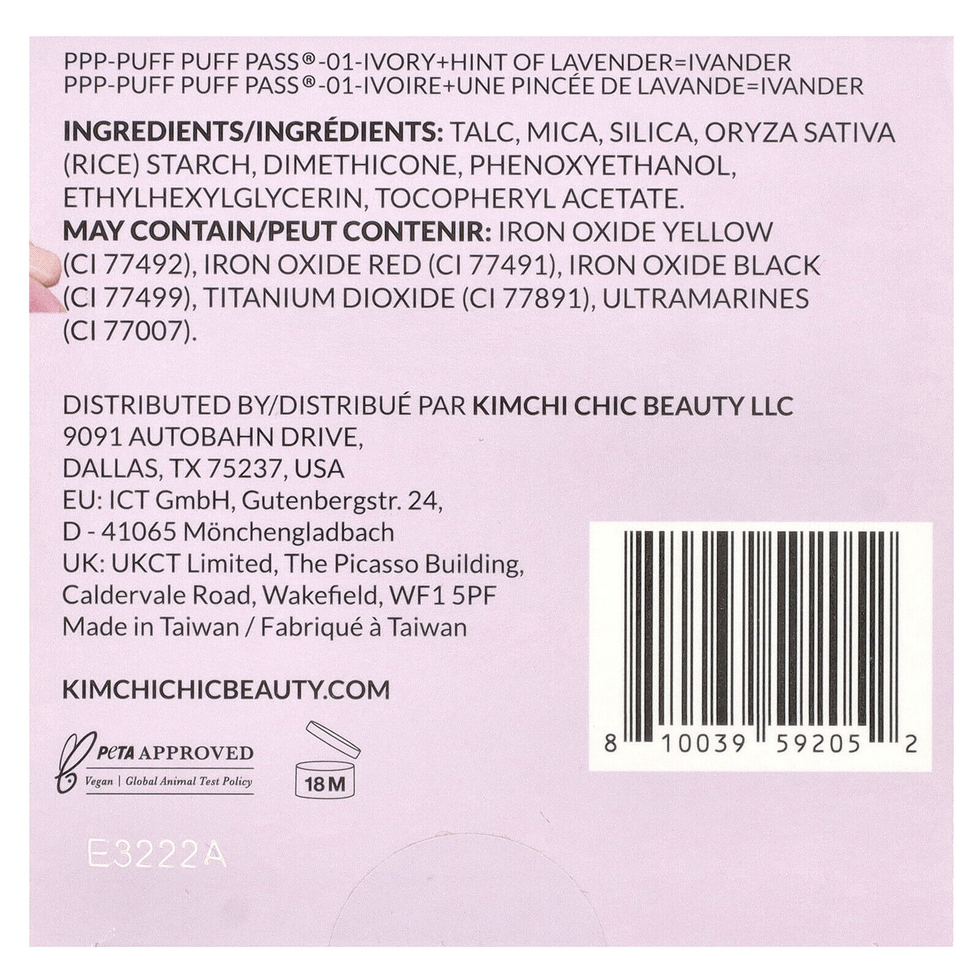Our receiving department does its best to verify and then enter the correct expiration dates for all incoming products. However, discrepancies do occur from time to time. This being said, the exceptionally high turnover at iHerb ensures that our inventory is among the freshest in the industry.KimChi Chic Beauty, Puff Puff Pass®, Set & Bake Powder, PPP01 Ivory + Hint of Lavender = Ivander, 0.85 oz (24 g)