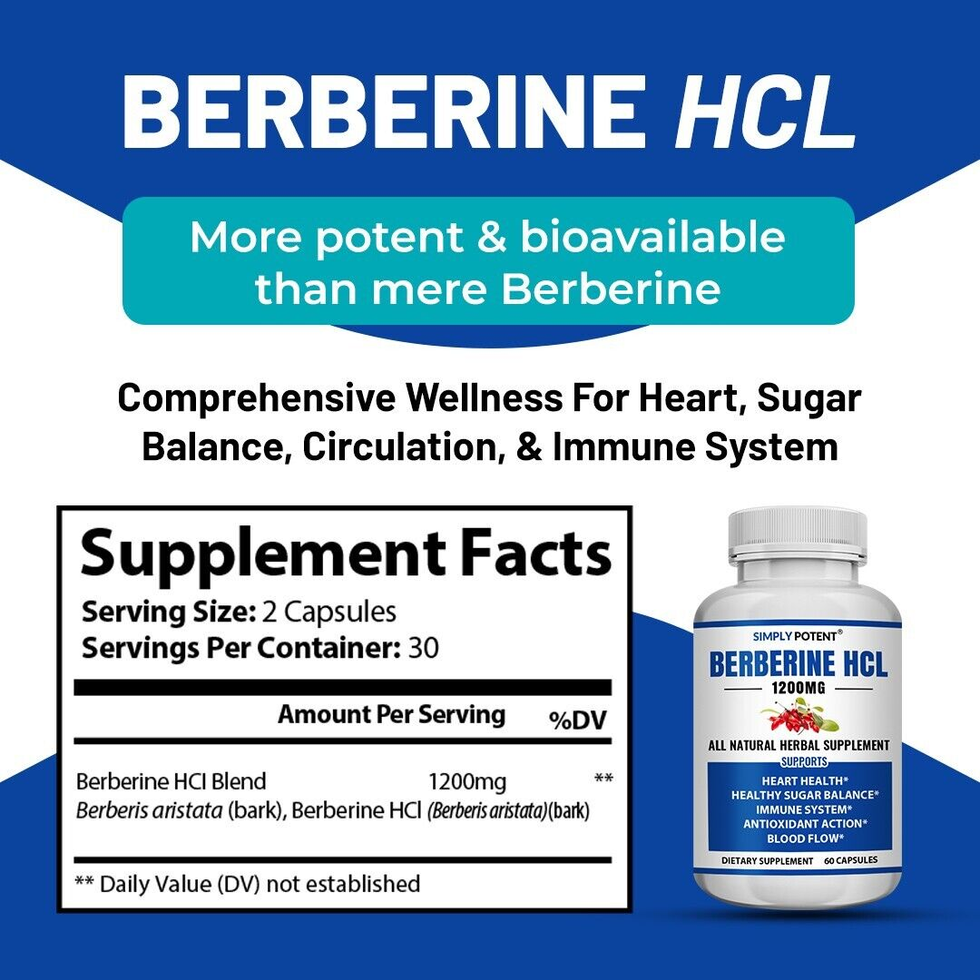 Simply Potent Berberine HCL 1200mg: An all-natural supplement for heart health, blood sugar levels, immune system, antioxidant support and blood flow! Berberine has been used widely in traditional medicines to alleviate health and wellness. Berberine HCL, the supplement form is a more stable, more bioavailable and easily absorbed form of Berberine which provides you with many benefits! Get your hands on pure Berberine HCL 1200mg from Simply Potent.