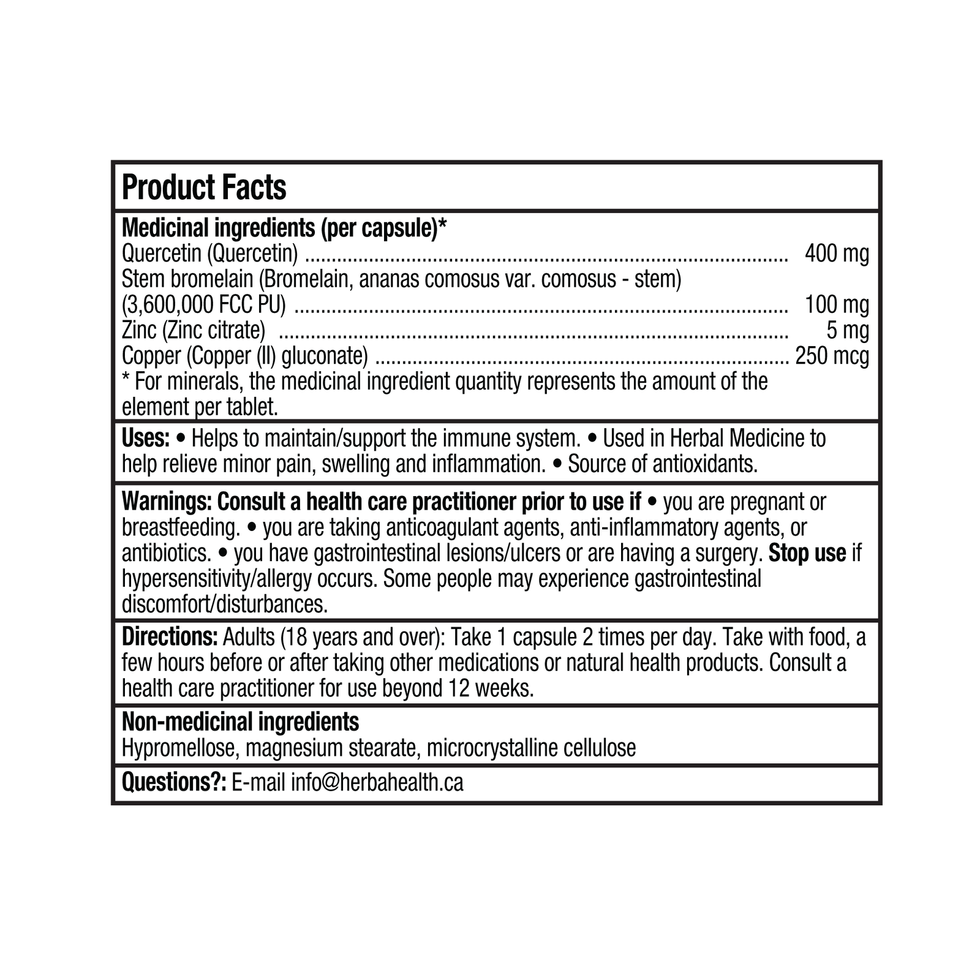 Herba's Quercetin supplements are expertly formulated with a blend of potent natural ingredients including quercetin, bromelain, zinc, and copper. Quercetin, derived from the Sophora japonica flower, is renowned for its rich history in traditional medicine. Bromelain, extracted from the stem of pineapples, adds a natural enzymatic boost. Zinc and copper, essential trace minerals, play crucial roles in overall wellness. Proudly made in Canada, this top-rated supplement is non-GMO, gluten-free, and adheres to cGMP manufacturing standards, ensuring the highest quality and safety for our customers. NPN: 80125379