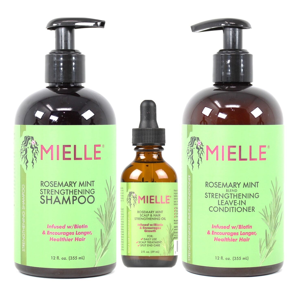 MIELLE Rosemary Mint Organics Infused with Biotin and Encourages Growth Hair Products for Stronger and Healthier Hair and Styling Bundle Set 3 PCS Set Includes: - Rosemary Mint Strengthening Shampoo 12oz / 355ml - Nourish and cleanse dry, weak, or brittle hair - Leave-in Conditioner 12oz / 355ml Hydrates while protecting & moisturizing. - Rosemary Mint Scalp & Hair Strengthening Oil 2oz / 59ml - Achieve longer, stronger, healthier hair with this organic hair oil from Mielle.
