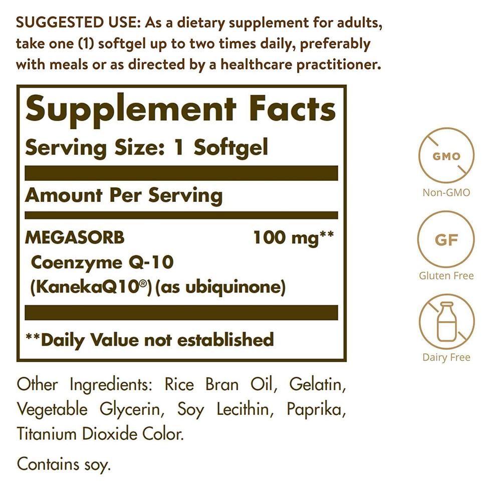 - Gluten, Wheat & Dairy Free; Solgar Megasorb CoQ-10 is free of: gluten, wheat, dairy, yeast, sugar, sodium, artificial flavor, sweetener, and color