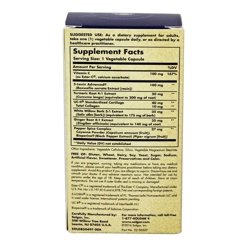 Vitamin C (as Ester-C, calcium ascorbate), 5-Loxin Advanced (Boswellia serrata Extract [resin]), Turmeric Root 4:1 Extract (Curcuma longa) (equivalent to 200 mg of root), UC-II Standardized Cartilage Total Collagen, White Willow Bark 5:1 Extract (Salix alba [bark]) (equivalent to 175 mg of bark), Ginger Root 4:1 Extract (Zingiber officinale) (equivalent to 140 mg of root), Pepper Spice ComplexCayenne Powder (Capsicum annuum [fruit]), Bioperine (Black Pepper Extract) (Piper nigrum [fruit]). Other Ingredients: Vegetable cellulose, silica, vegetable magnesium stearate. Free Of: Gluten, wheat, dairy, soy, yeast, sugar, sodium, artificial flavor, sweetener, preservatives and color.