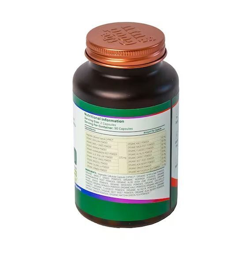 List of ingredientsVegetable Cellulose Capsule (HPMC)*, Organic Barley Grass Powder, Organic Spirulina Powder, Organic Kale Powder, Organic Moringa, Organic Wheatgrass Powder, Organic Broccoli Powder, Organic Chlorella Powder, Organic Spinach Powder, Organic Maca Root Powder, Organic Ashwagandha, Organic Aloe vera leaf, Organic Beetroot, Organic Milk thistle, Organic Alfalfa, Organic Carrot Powder, Organic Flaxseed Powder, Organic Acai berry, Organic Ginger, and Organic Matcha green tea, *Approved non-organic ingredient