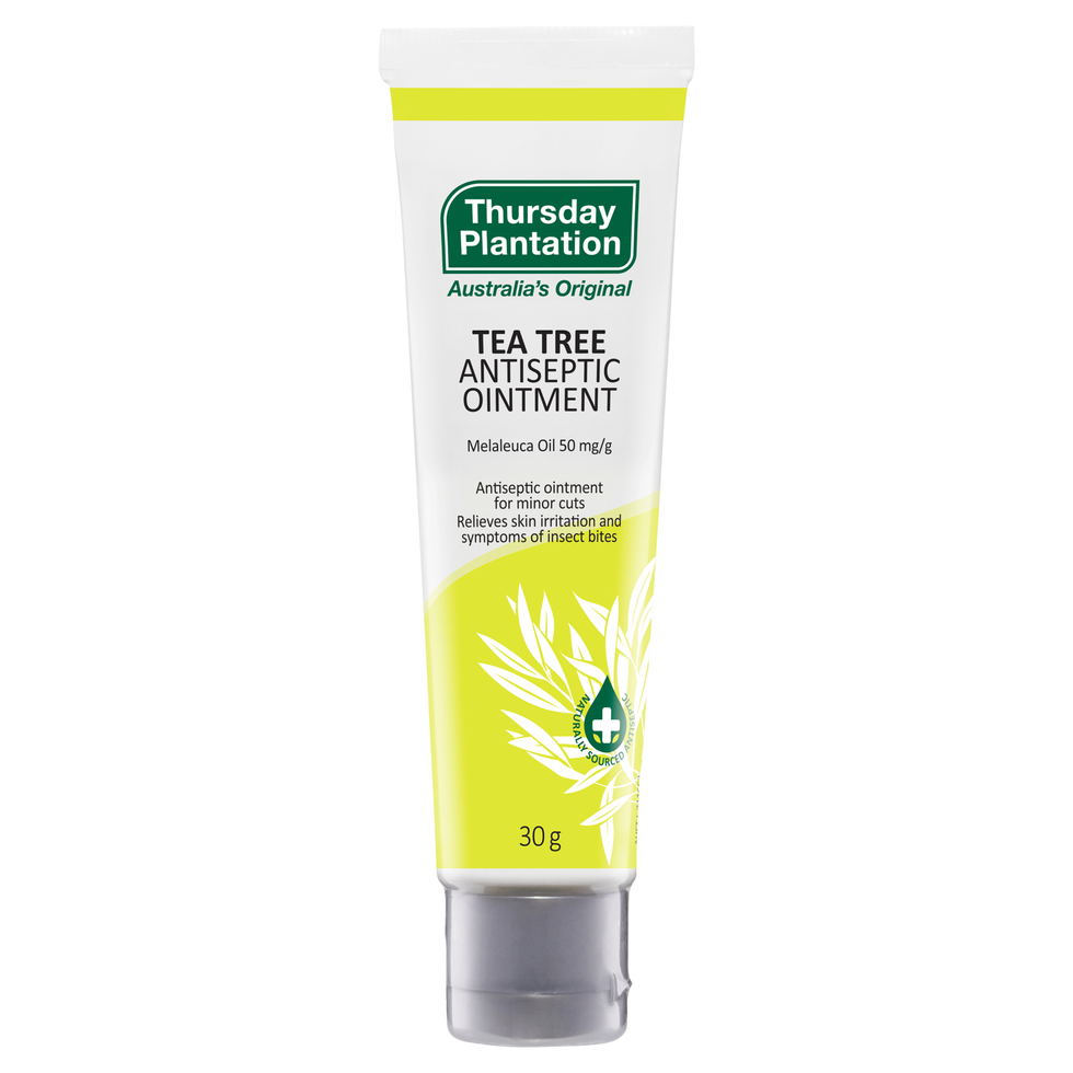 Thursday Plantation’s Tea Tree Antiseptic Ointment for minor cuts & abrasions relieves skin irritations and symptoms of insect bites & stings.