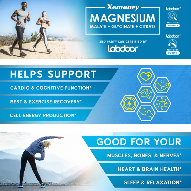 HIGHLY ABSORBABLE MAGNESIUM SUPPLEMENT: Xemenry Triple Magnesium Complex contains 300 mg of three pure forms of magnesium (glycine, malate, citric acid). Each is chelated or highly absorbable for maximum bioavailability.