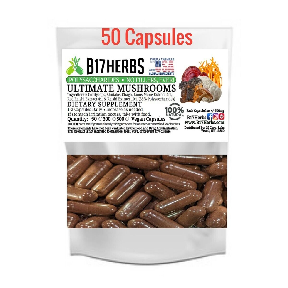 div>INGREDIENTS: This blend consist of Equal Parts Cordyceps Fruiting Body Powder (Non Extract), Chaga Fruiting Body Powder (Non Extract), Shiitake Fruiting Body (Non Extract), Lions Mane Dual Extract 4:1, Red Reishi Dual Extract 4:1 and Reishi Extract 10:1 (35% Polysaccharides) [P]owder inside of VeganCaps | each Cap is size 00 with +/- 500mg of Dried [H]erbal [P]owder with NO Fillers SUGGESTED USE: As a [d]ietary [s]upplement take 1-2 caps 1-2 times daily. If an upset stomach occurs, try taking with a meal. ✔️ Gluten Free ✔️ 100% Natural ✔️ No Fillers, EVER! ✔️ No Artificial Additives SAFETY GUIDELINES: All of our products and herbs are intended for use by healthy adults over the age of 18 years of age and are to be used at your own discretion. We are not [l]iable for assumed or unknown information by the consumer. ALLERGEN INFORMATION: Our products do not contain any Yeast, Wheat, Gluten, Soy, Eggs, Fish, Shellfish, Dairy or Tree Nut ingredients. NOTE: Items are produced in a facility with equipment that may process other products containing these allergens. WARNING: DO NOT use if you are [p]regnant, might be [p]regnant or are [l]actating. DO NOT consume if you are already taking any over the counter or [p]rescribed [M]edications. Please consult with your [d]octor before using this or any other dietary product. Store in a cool dry place. Keep away from [c]hildren and Pets. DISCLAIMER: These statements have not been evaluated by the [F]ood and [D]rug [A]dministration. This product is not intended to [d]iagnose, [t]reat, [c]ure, or prevent any [d]isease.