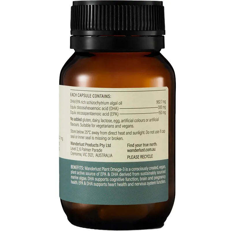 Vegan Omega-3 - EPA and DHA derived from sustainably sourced marine algae to support brain and heart health. A consciously created, vegan, plant-active Omega-3, derived from marine algae to provide a sustainable source of EPA and DHA.Cognitive function: DHA supports cognitive function and brain health.Nervous system: EPA and DHA support nervous system health.Heart health: EPA and DHA support heart and cardiovascular system health.Pregnancy health: DHA supports healthy foetal development and pregnancy health. Nature's wisdom, is distilled. Boxed Contents: 30 Capsules Size: 30 Capsules Warnings Advise your doctor of any medicine you take during pregnancy; particularly in your first trimester. Ingredients Each capsule contains:DHA/EPA rich schizochytrium algal oil 962.7 mgEquiv. docosahexaenoic acid (DHA)-------300 mgEquiv. eicosapentaenoic acid (EPA) ------- 150 mgNo added gluten, dairy, lactose, egg, artificial colours or artificial flavours.Suitable for vegetarians and vegans. Directions Adult dosage:Cognitive Function, Brain Health & Nervous System Health: Take one capsule daily.Heart Health: Take two capsules daily.Pregnancy Health: Take two capsules daily.With a main meal or as directed by your healthcare practitioner. CPPWanderlust Plant Omega 3 30 Capsules