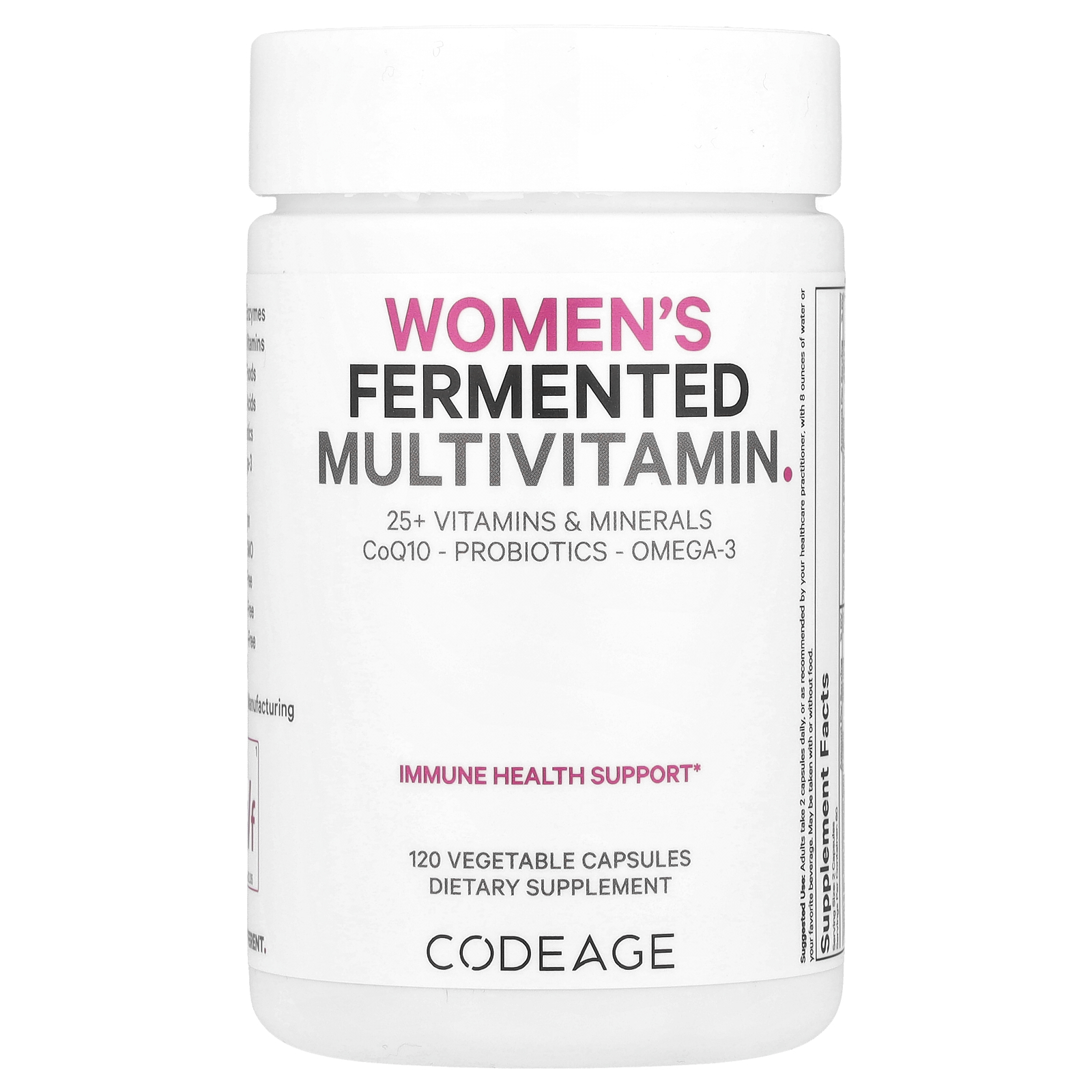 25+ Vitamins & Minerals CoQ10 Probiotics Omega-3 Immune Health Support Dietary Supplement Digestive Enzymes Essential Vitamins Whole Foods Amino Acids Vegan Non-GMO Soy-Free Dairy-Free Gluten-Free cGMP Certified Manufacturing Feel Different Codeage Women's Daily Multivitamin is a comprehensive all-in-one capsule formula that offers 25+ daily vitamins and minerals for women of all ages. It contains a blend of real whole foods vitamins, probiotics, enzymes, organic veggies, fruits, and herbs.SUGGESTED USE: