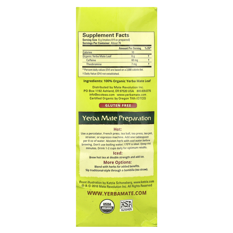 Organic & Fair Trade One Pound Loose Tea Herbal Supplement Naturally Caffeinated USDA Organic Organic Argentina Kosher Gluten Free Certified Organic by Oregon Tilth (OTCO) Organic Means Non-GMO Our Products are Made With 100% Non-GMO Ingredients Yerba mate tea is brewed from the leaves of a holly tree native to the rainforests of South America. EcoTeas yerba mate is dried with warm air instead of smoke for a clean, smooth taste. A Sustained Energy Tea Supplement Enhances physical energy Stimulates mental clarity Supports weight loss regimens that include a balanced diet and exercise Elevates mood Aids elimination Antioxidant Power When brewed as directed, this tea provides an ORAC value of 10,000 µmoITE/240 ml, which is 5 times stronger than a typical cup of green tea. Our Eco Commitments USDA Organic - Long before we started EcoTeas, we were organic gardeners. For us, organic comes first. As three best friend working in partnership with small farmers around the world, Fair Trade is just part of who we are. Our love of nature runs deep. Planting native trees in South America is a small gift back to the world. Proud to Support Clean Energy - We offset our office electricity usage with green energy from the Bonneville Environmental Foundation (BEF). Proud to be Water Steward - For every eight ounces of water used to brew our tea, we work with BEF to restore eight ounces of water to the Klamath River Watershed in southern Oregon.SUGGESTED USE: