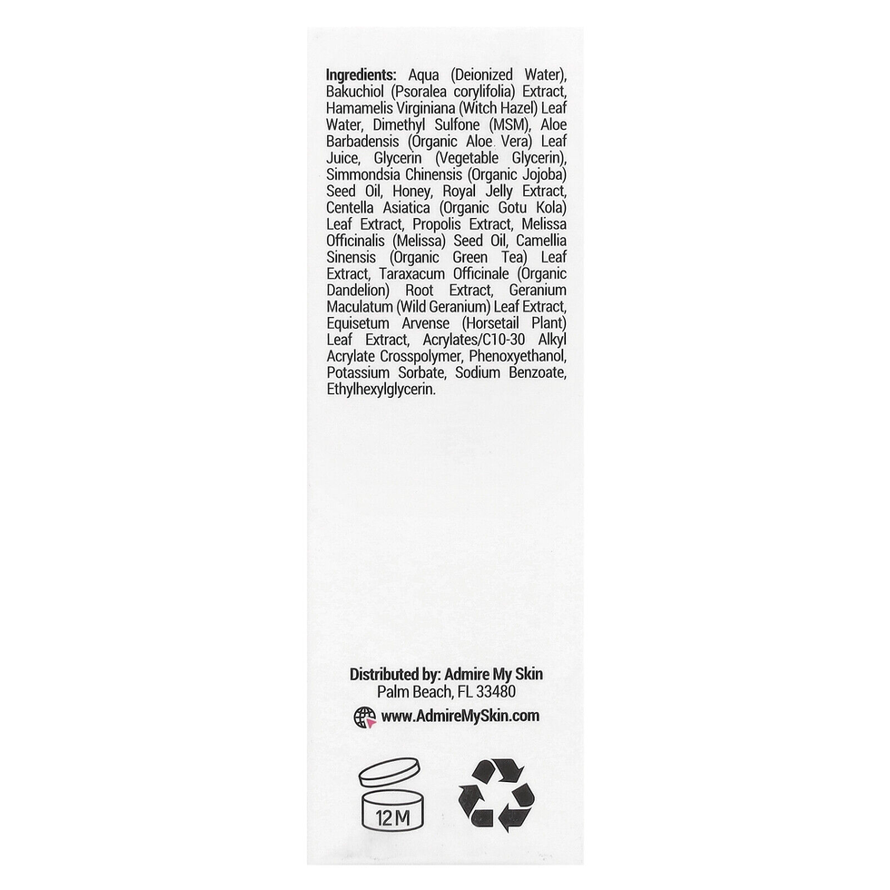 Aqua (deionized water), bakuchiol (psoralea corylifolia) extract, hamamelis virginiana (witch hazel) leaf water, dimethyl sulfone (msm), aloe barbadensis (organic aloe vera) leaf juice, glycerin (vegetable glycerin), simmondsia chinensis (organic jojoba) seed oil, honey, royal jelly extract, centella asiatica (organic gotu kola) leaf extract, propolis extract, melissa officinalis (melissa) seed oil, camellia sinensis (organic green tea) leaf extract, taraxacum officinale (organic dandelion) root extract, geranium maculatum (wild geranium) leaf extract, equisetum arvense (horsetail plant) leaf extract, acrylates/c10-30 alkyl acrylate crosspolymer, phenoxyethanol, potassium sorbate, sodium benzoate, ethylhexylglycerin.
