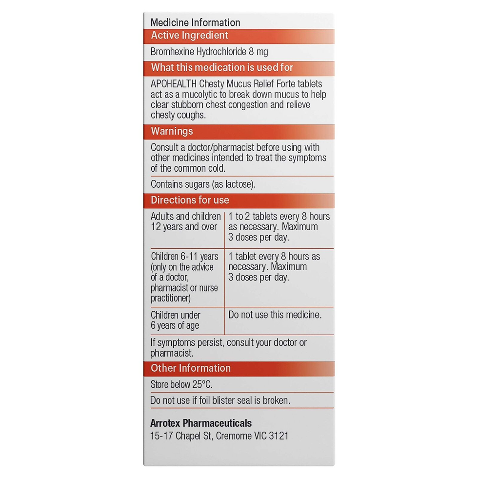 Relieve chest congestion and mucus buildup with Apo Health Chesty Mucus Relief Forte. Each tablet contains 8mg of active ingredient to break up and loosen stubborn mucus, providing fast and effective relief. With 100 tablets in each pack, you can soothe your symptoms and breathe easier for longer. Trust Apo Health for powerful and reliable mucus relief. CPP