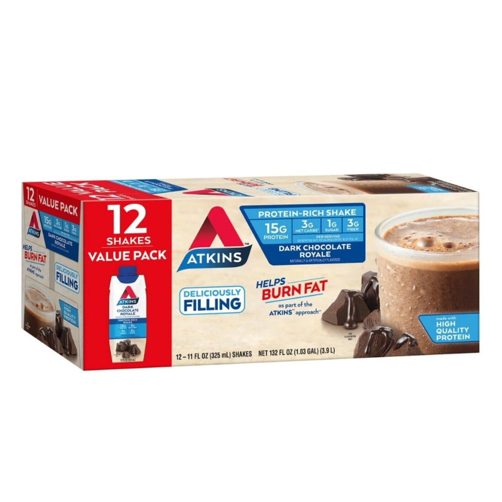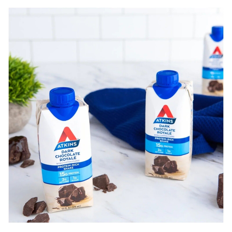 - AT HOME OR ON-THE-GO. Atkins Dark Chocolate Royale Protein Shakes. Enjoy delicious shakes that fit right into your busy schedule, with 15g of protein, 2g of net carbs, and 1g of sugar per serving*. This is Today’s Atkins™.