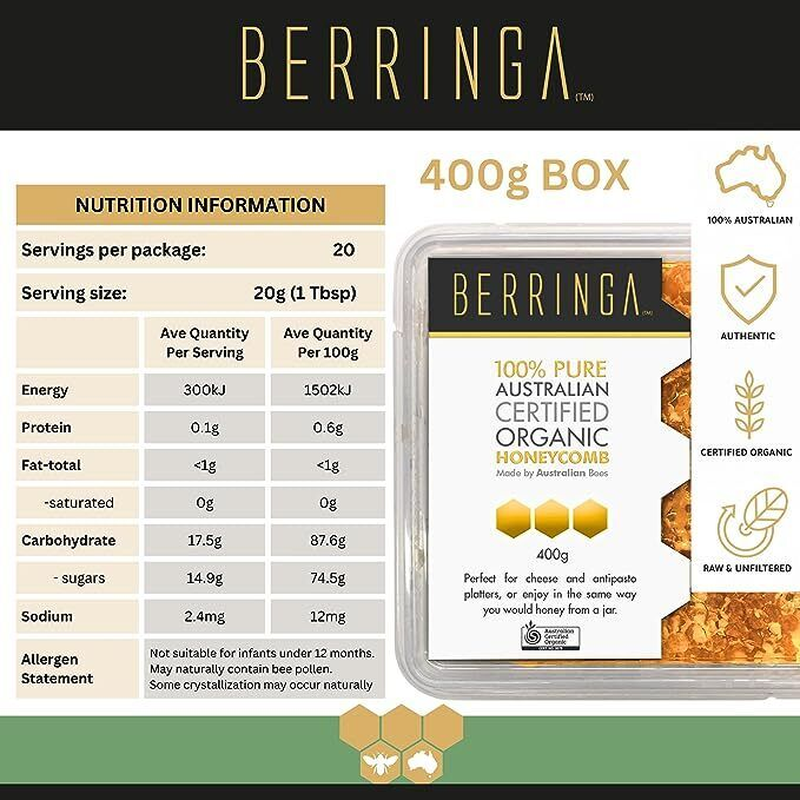 Details Berringa is an Australian-owned company that only sources 100% Australian honey. Berringa believes that high-quality Australian honey is unbeatable, from Eucalyptus to “Super Manuka”. They are also strong advocates and supporters of sustainable farming, and we work closely with beekeepers to ensure good farming practices.Berringa Honeycomb is a delicious combination of 100% Australian Eucalyptus Honey and Honeycomb packed in a sealed tub. Guaranteed to be Australian Certified Organic (ACO), you can be sure of the purity and superior quality of this product. Delicious and versatile, honeycomb adds a gourmet flair to any meal. It looks great as part of a cheese or antipasto platter, can be broken up and sprinkled onto desserts and breakfast dishes, or simply eaten the same way you would honey from a jar. Features 100% Australian Certified Organic Honeycomb and HoneyPure, natural honey may vary in colour and texture.Some crystallisation may occur naturally.May contain naturally occurring dark spots, in the wax comb only. Perfect for cheese and antipasto platters, or enjoy in the same way you would honey from a jar. Do not use if the lid seal is damaged or broken. Not Suitable for infants under 12 months.Pure, natural honey may vary in colour and texture.Some crystallisation may occur naturally.May contain naturally occurring dark spots, in the wax comb only. CPP