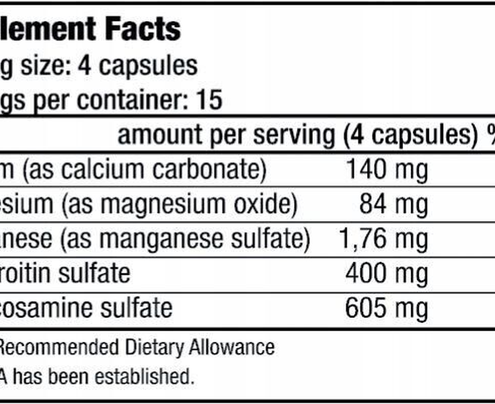 Calcium salts of orthophosphoric acid, D-glucosamine sulfate (from shellfish), capsule shell [gelatin, purified water, colors (titanium dioxide, brilliant blue FCF, tartrazine***)], chondroitin sulfate, calcium carbonate, magnesium oxide, anti-caking agents (magnesium salts of fatty acids, silicon dioxide), manganese sulfate. ***Tartrazine may have harmful effects on activity and attention in children.