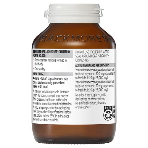 Help reduce the occurrence of medically diagnosed cystitis with Blackmores Cranberry Forte 50,000 capsules. This dietary supplement for women is a concentrated cranberry extract to support urinary tract health. One in two women may experience cystitis which produces a painful burning experience. The antioxidants in cranberries work to reduce the free radicals formed in the body and have anti-adhesion properties.. Adults: Take 1 capsule once a day for maintenance of urinary tract health.
