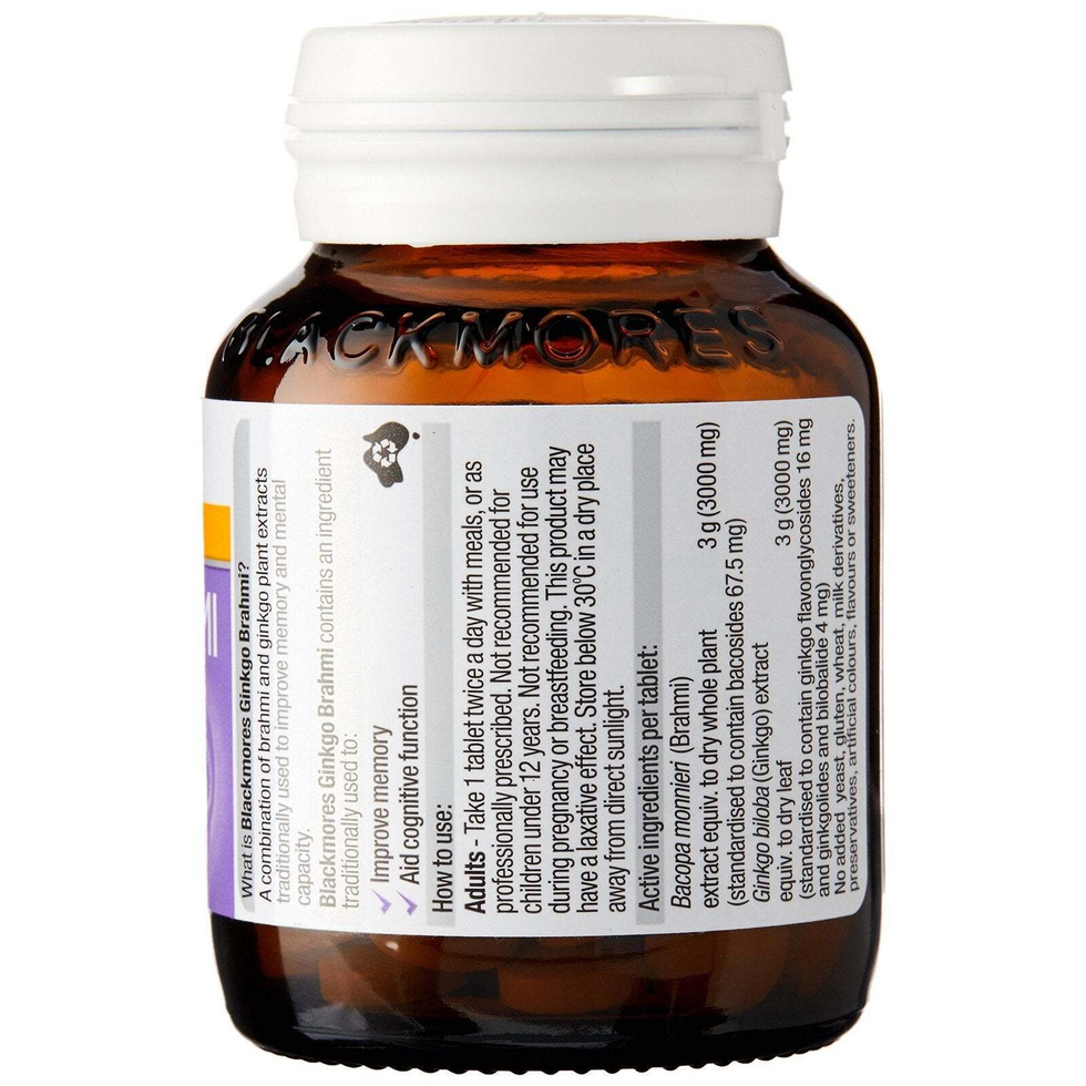 OverviewBlackmores Ginkgo Brahmi is a source of traditionally used herbs in Ayurvedic medicine to improve memory and mental capacity.Improves memory. Aids cognitive function.Directions for UseAdults – Take one tablet twice daily with meals, or as professionally prescribed.Children (under 12 years) – Not recommended for children under 12 years. IngredientsActive ingredients per tabletBacopa monnieri (brahmi)extract equiv. to dry whole plant 3 g (3000 mg)Bacopa monnieri- brahmiGinkgo biloba (ginkgo)extract equiv. to dry leaf 3 g (3000 mg)Gingko biloba- ginkgoContraindications and cautionsDiscontinue use at least 2 weeks before surgery. Ginkgo may increase the risk of bleeding associated with surgery. Not recommended for use during pregnancy or breastfeeding May cause mild laxative effect. May rarely cause mild headache or dizziness. CPP