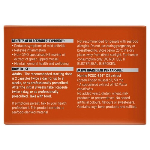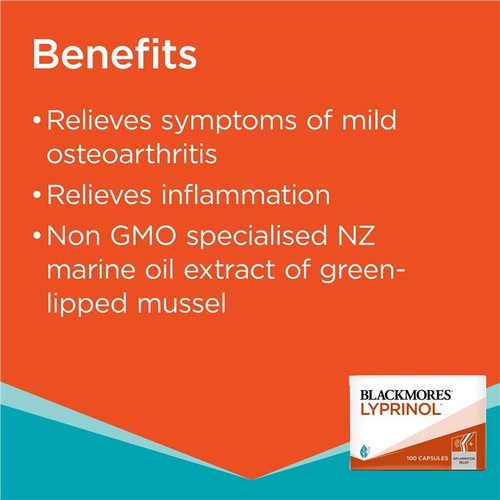 Blackmores Lyprinol® is non-GMO specialised NZ marine oil extract of green-lipped mussel which reduces symptoms of mild osteoarthritis, relieves inflammation and help maintain general health and wellbeing.