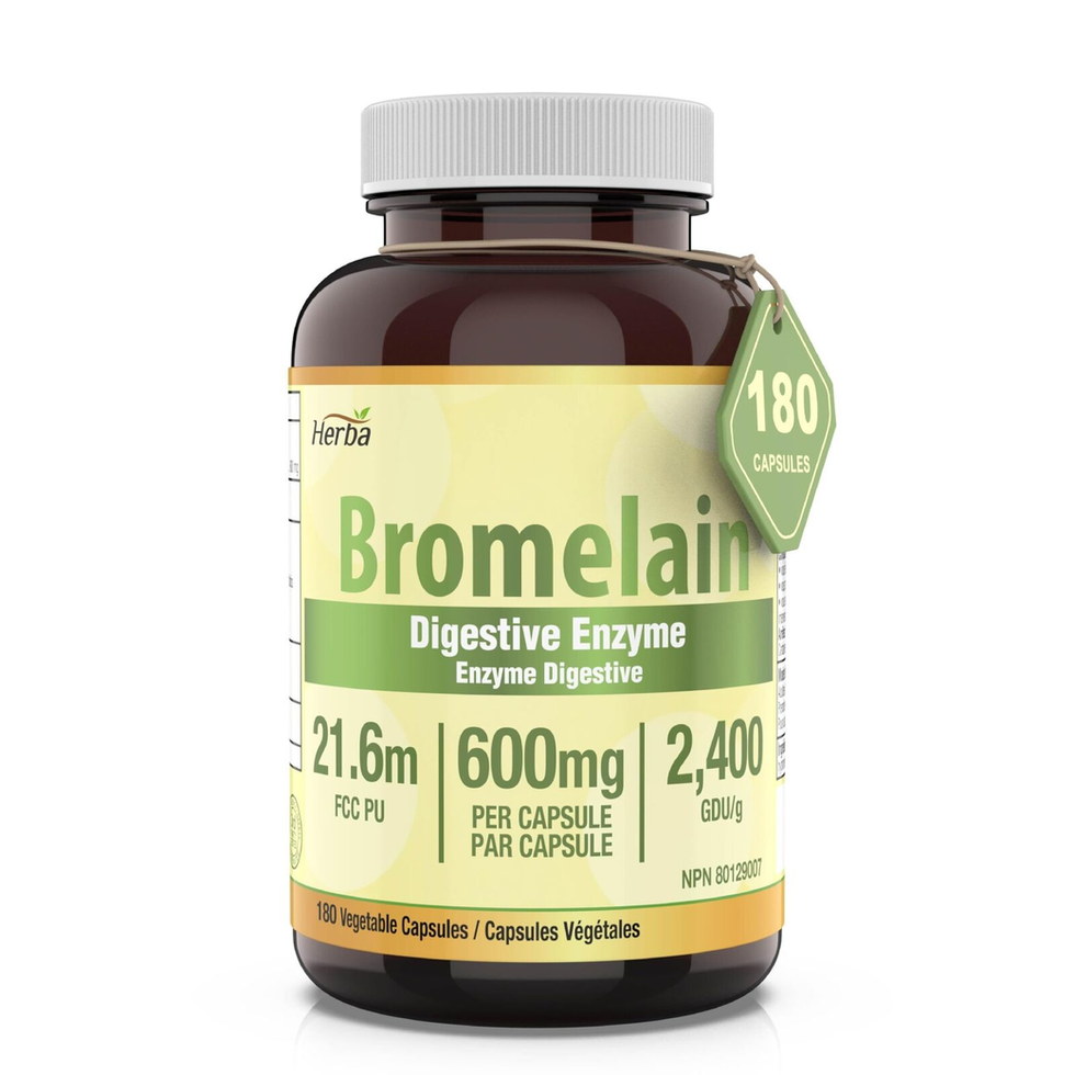 Herba's Bromelain Supplements harness the power of bromelain, an enzyme extracted from the stems of non-GMO pineapples (Ananas comosus var. comosus). This potent digestive enzyme has been traditionally uséd for its impressive enzymatic properties. Each capsule delivers 600mg of high-quality bromelain, providing 21,600,000 FCC PU and 2,400 GDU/g, making it an essential addition to your dietary regimen. Crafted in Canada, these supplements meet cGMP manufacturing standards and undergo rigorous third-party testing to ensure purity, safety, and potency.