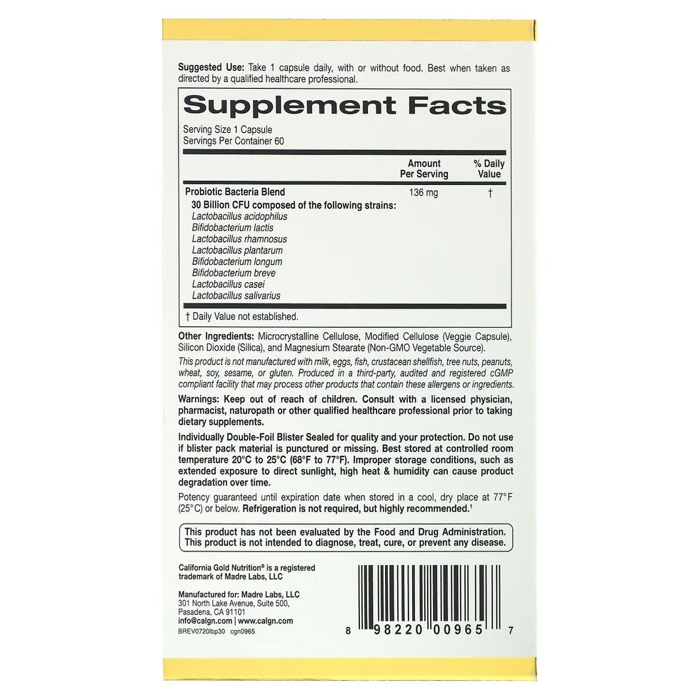 California Gold Nutrition Lactobif Probiotics 30 Billion CFU 60 Veggie Capsules